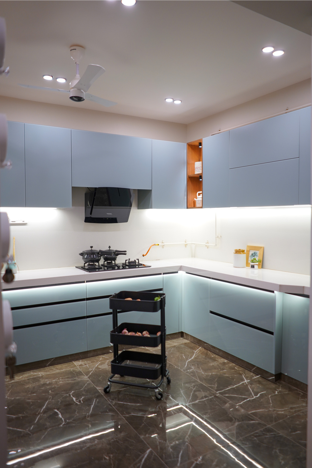 In this Modern kitchen, Matt light blue cabinets finished in glass are paired with while quarts stone backsplash and counter top, veneer open niches with light further beautifies the kitchen even more.