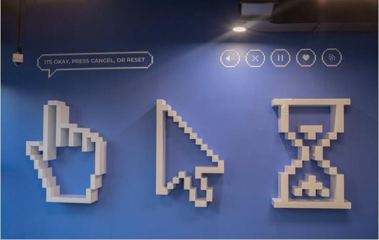 Prominent icons related to technology adorn the walls, encouraging eon to reset and start again whenever one needs to