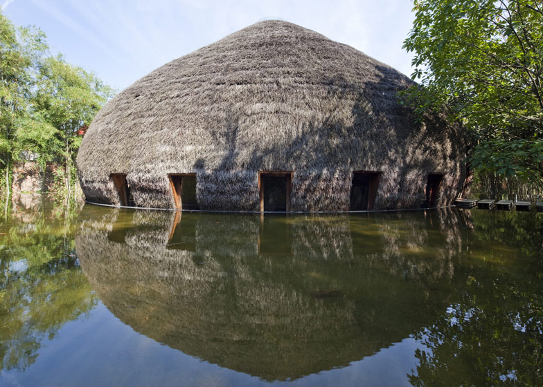 This unique thatched bamboo dome is located at the center of a lake in Binh Duong Province. For this dome, a structural bamboo arch system was designed which is 10m high and spans 15m across.