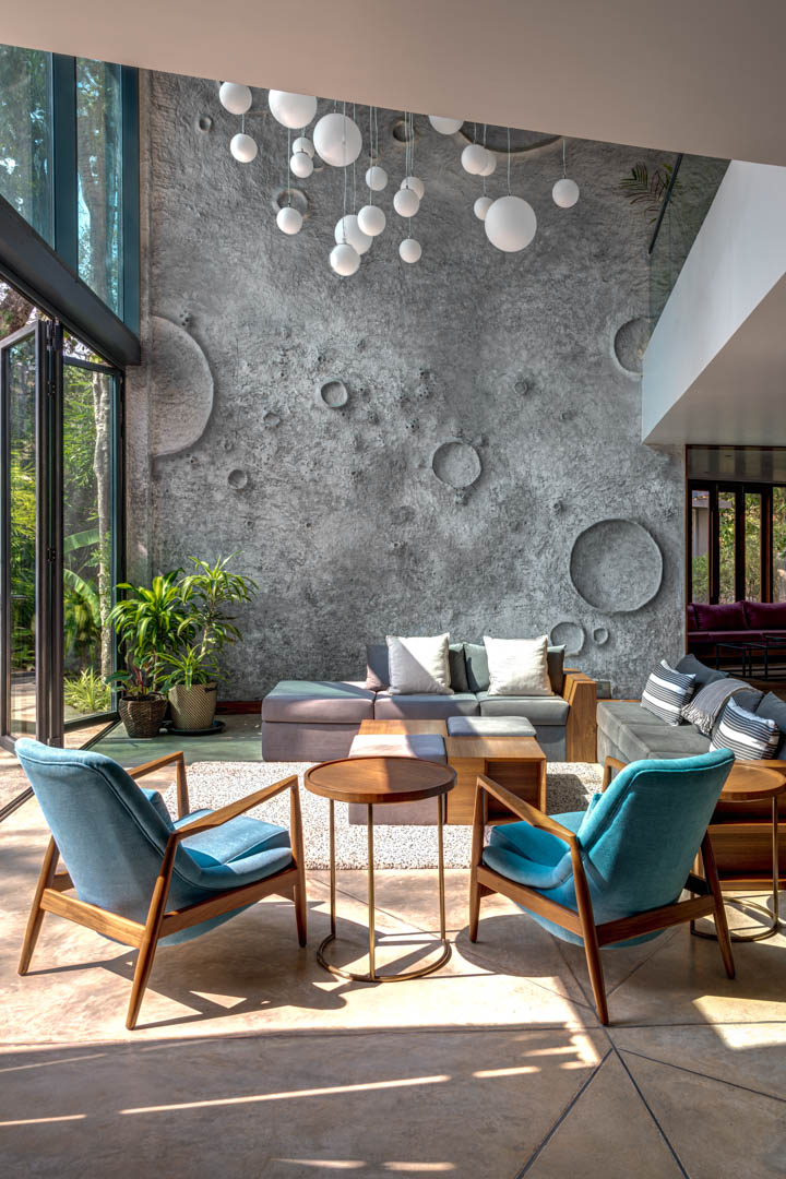 The Moon House,designed by SAV Architecture + Design, nestled among three homes in Goa, India,draws its inspiration from the moon's curves and textures. Its design merges the cozy feel of tropical living with the dynamic lines of modern architecture, creating a space that flows with nature. Surrounded by trees, the house boasts a unique curved entrance and a textured facade made of local slate stone. Inside, a crescent-shaped pool steals the show, giving the house its focal point. The firm has shared more details with SURFACES REPORTER (SR). Take a look: