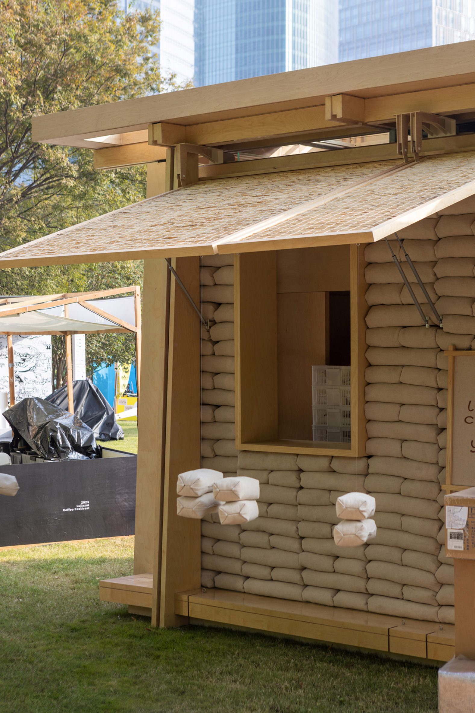 Designed by local studio FOG Architecture, the Cycle Cycle Mobile Bakehouse in Hangzhou, China, features walls constructed from stacks of grain sacks. The pop-up cafe and bakery emerged in response to Shanghai's Covid-19 lockdown, aiming to revitalize public space through food exploration. Read more below on SURFACES REPORTER (SR):