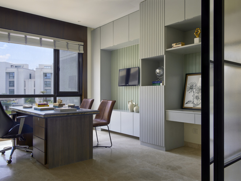 A full-length fluted glass partition marks the entrance to the home office, bathing the room and adjacent passage in natural light. The space is enhanced by a distinctive marble table with functional drawers and tan leather chairs, exuding a sense of opulence.