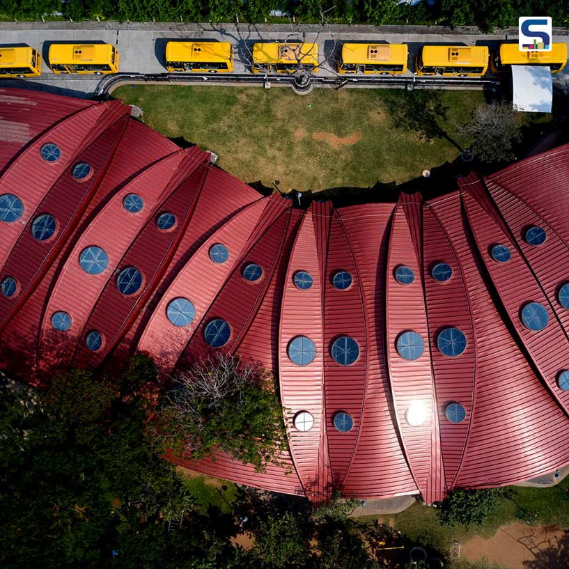 At the heart of the Shiv Nader School project is a striking red aluminium roof, its sweeping, undulating form inspired by the overlapping banana leaves that dominate the local landscape.