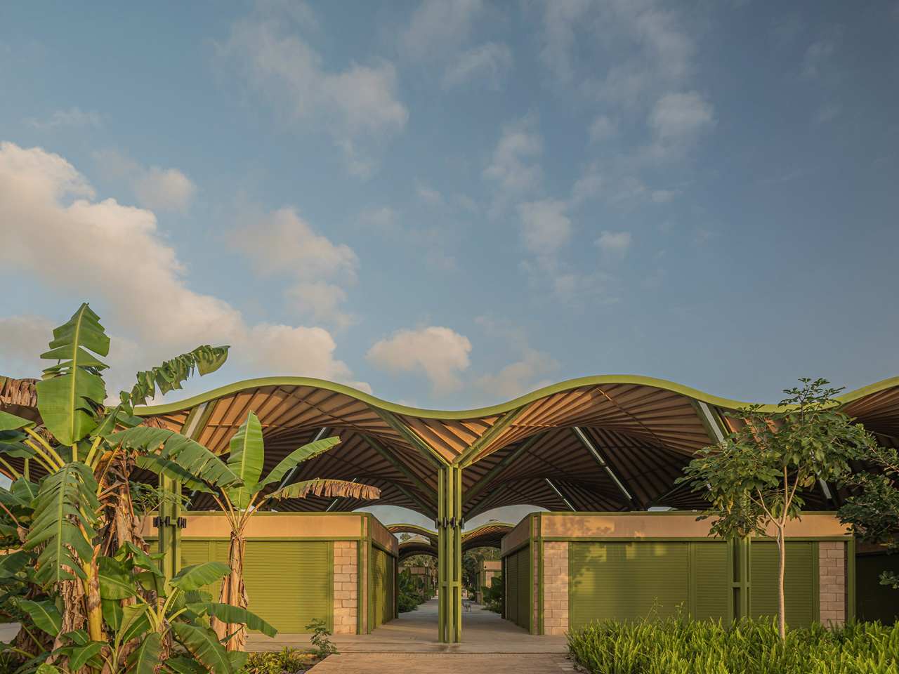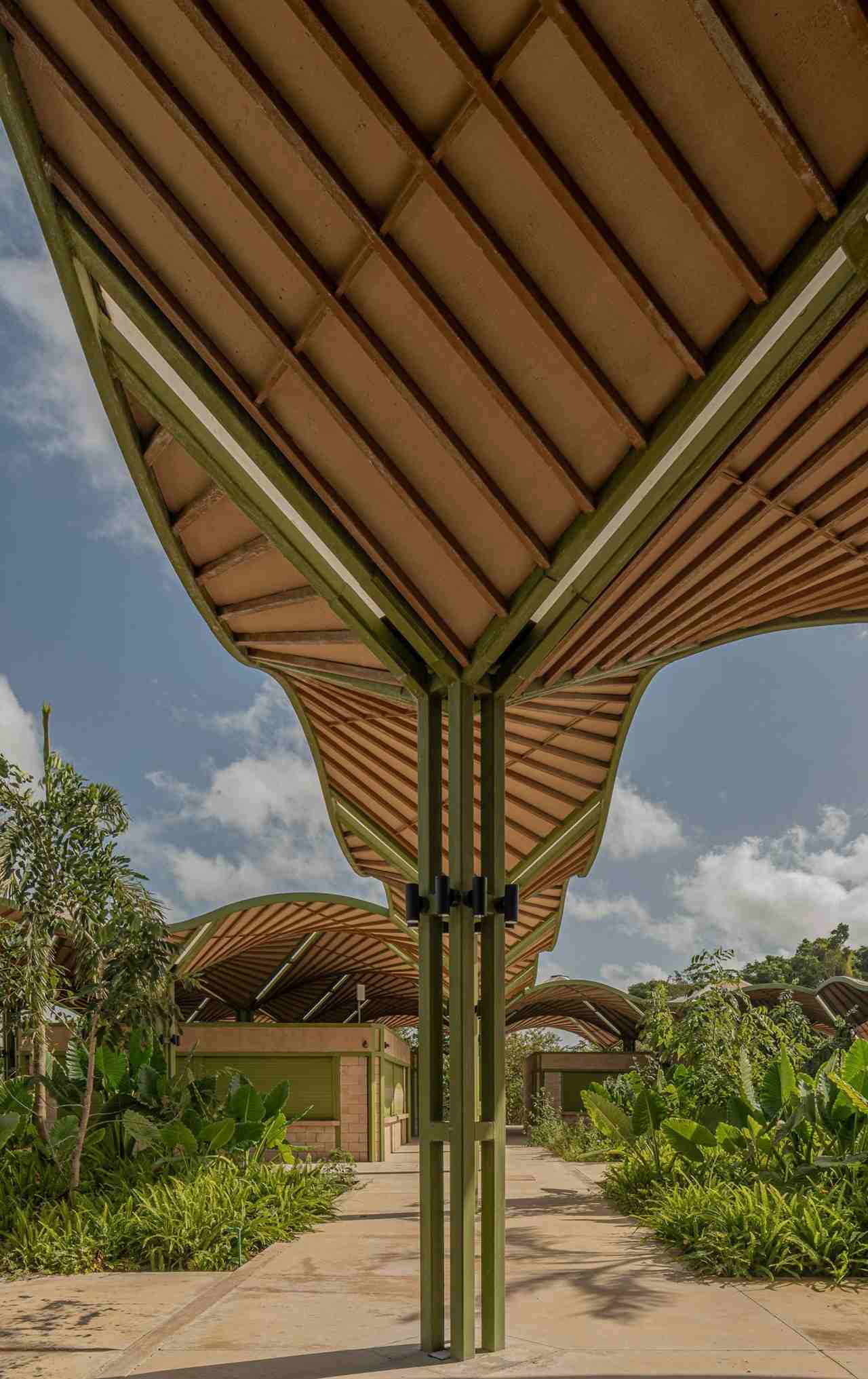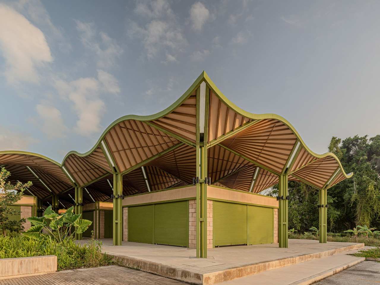 The studio approached the project with an unusual balance of practicality. At first glance, the market’s defining feature, which is a series of inverted umbrella-like vaults, commands attention with their sculptural grace. But beyond their aesthetic appeal, these parabolic roof forms serve as an essential environmental purpose. In a region known for its hot and humid tropical climate, the vaults naturally ventilate the interiors by drawing hot air upward while creating generous shaded zones below. This passive design approach ensures that the marketplace remains comfortable for vendors and visitors alike, without heavy reliance on mechanical cooling systems.