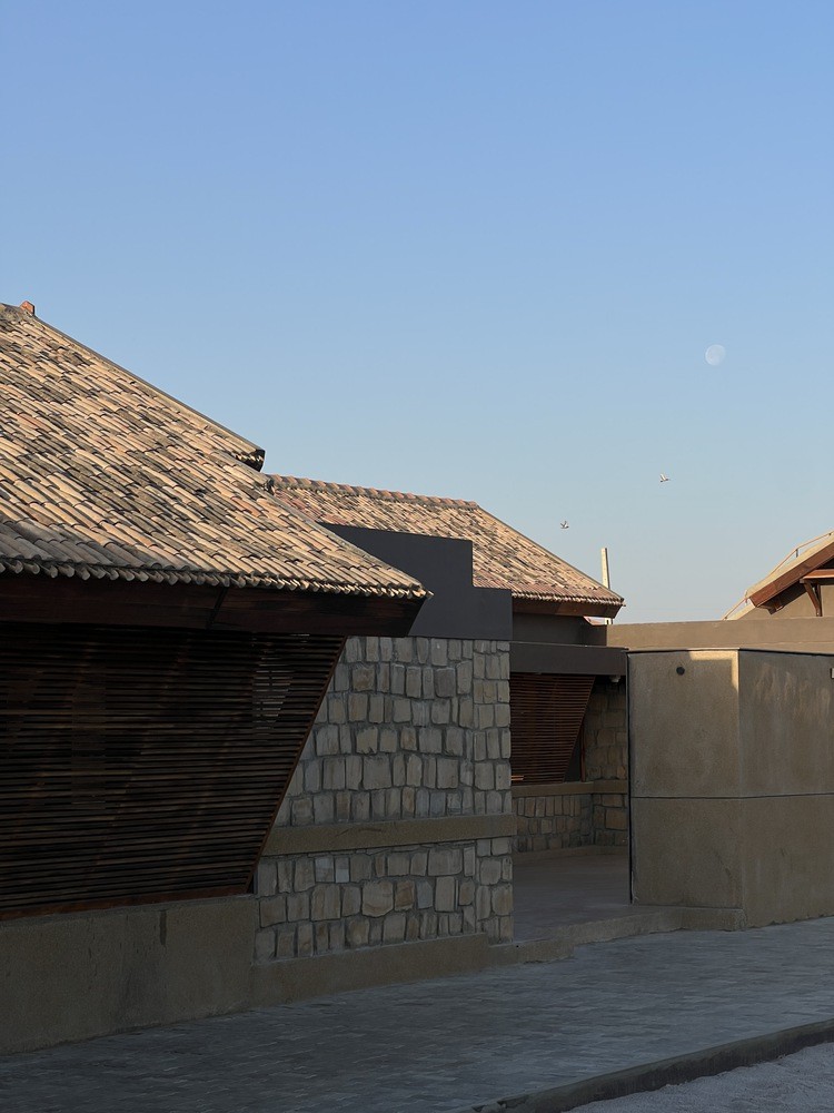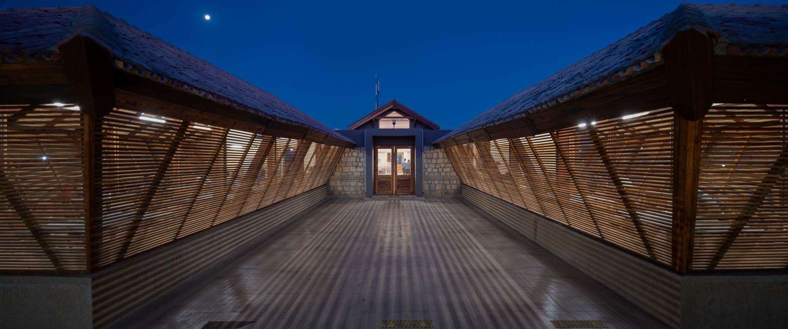 Beyond its environmental function, the mud roll roof also carries social significance. The inclusion of locally sourced wool revives demand for the produce of regional shepherds. In this way, the design extends its impact beyond the site, supporting local livelihoods and sustaining traditional economies. The handcrafted mud rolls lend the ceiling a rich, tactile character, with their soft, earthy hues and irregular textures echoing the surrounding landscape.
