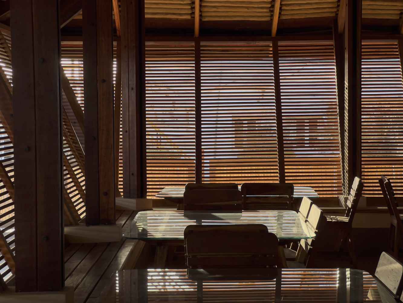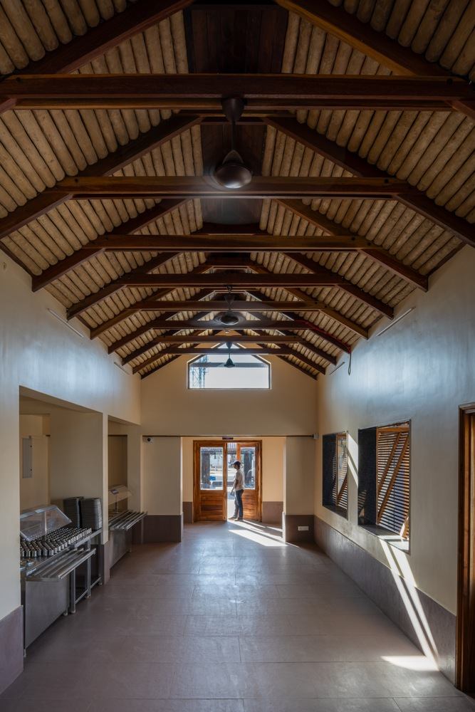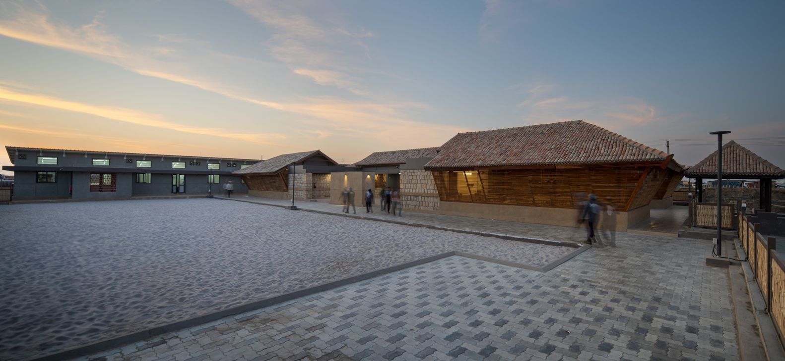 The building’s facades are equally mindful of climate and craft. Each dining bay is wrapped in horizontal wooden jaalis fabricated from scrap timber obtained from local sawmills. These porous screens allow air to circulate freely, reducing heat buildup while diffusing the intense sunlight of Kachchh. The result is a shaded, naturally ventilated interior that minimizes reliance on mechanical cooling systems.