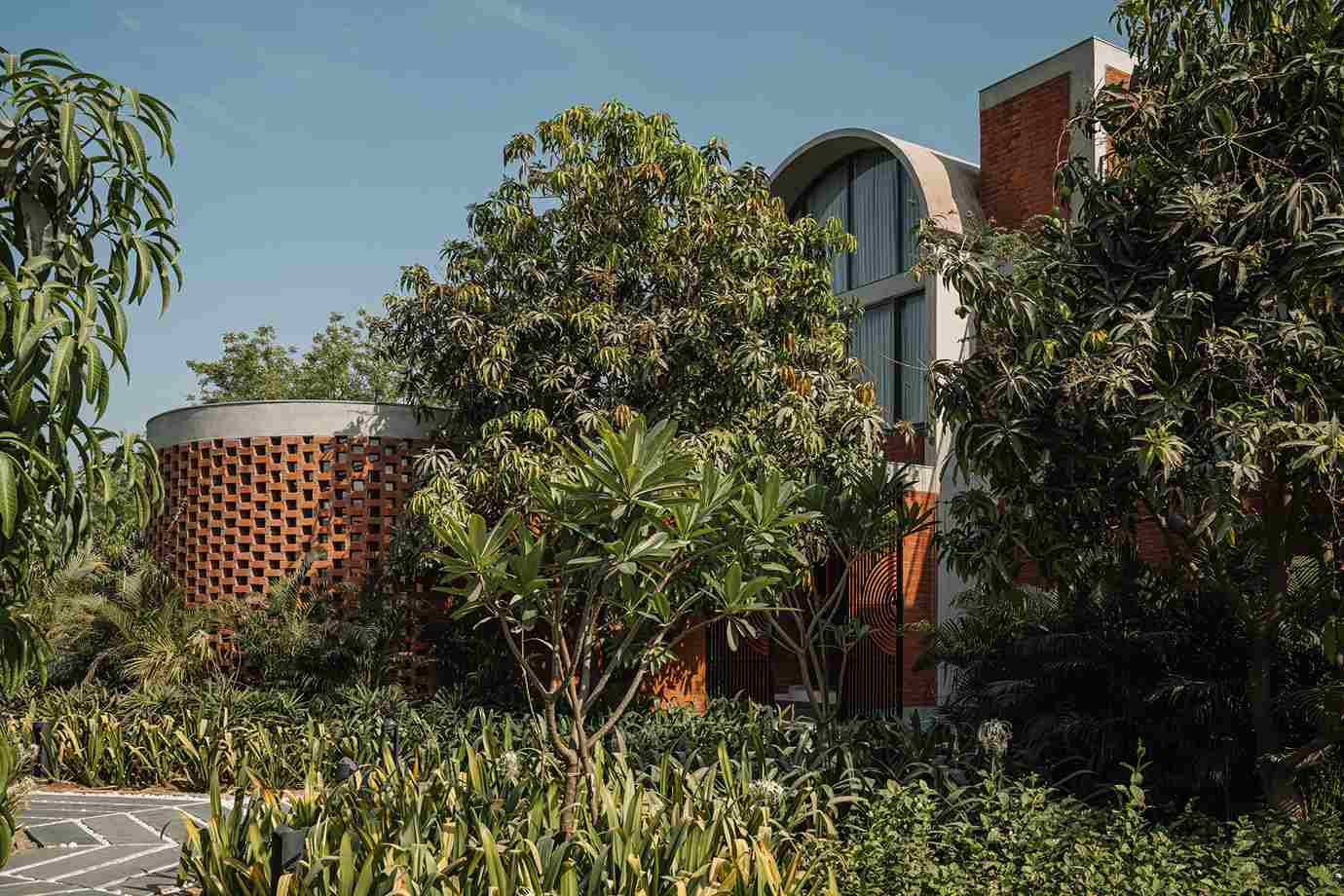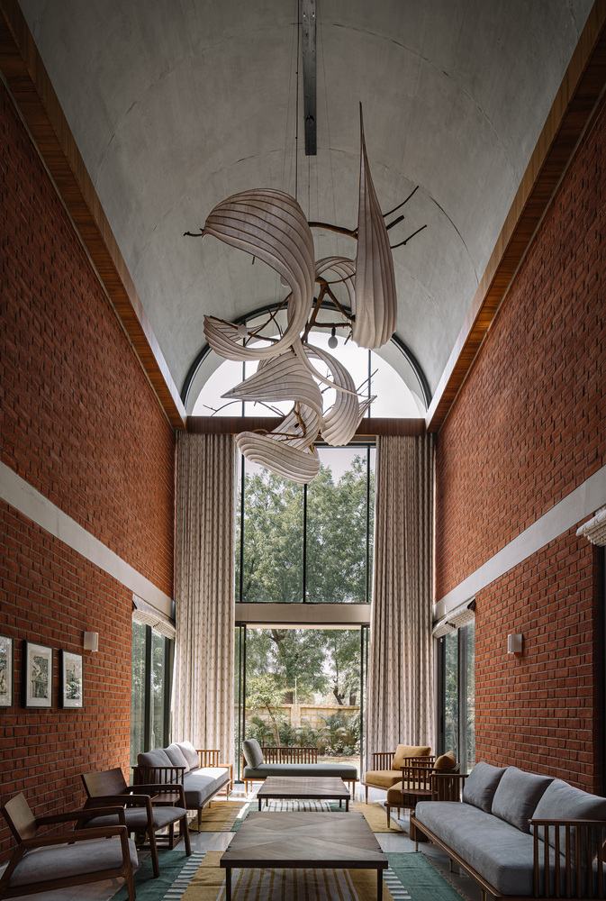 Exposed brick load-bearing walls and terracotta jaali screens create a warm, tactile envelope that contrasts beautifully with the cool strength of the concrete vaults above.