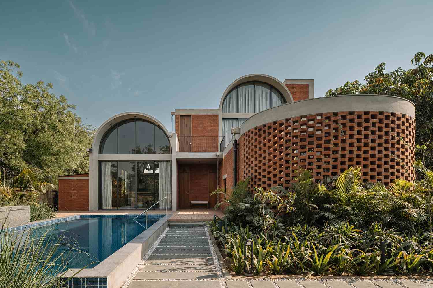 Even before entering the residence, a vintage red Contessa parked at the gate sets the mood. The prized possession is a playful symbol of the homeowner’s fondness for the past and a fitting introduction to the home’s character within. The Teen Vaults House sits serenely amidst a lush, green setting that exudes calm and continuity. What began as a simple plan for a weekend retreat, evolved into a permanent family residence. Initially conceived as a leisure home with a pool and pavilion, the project grew in ambition when the owners, a couple with two children, became enamoured by the site’s tranquility and charm. They chose to make it their full-time dwelling.