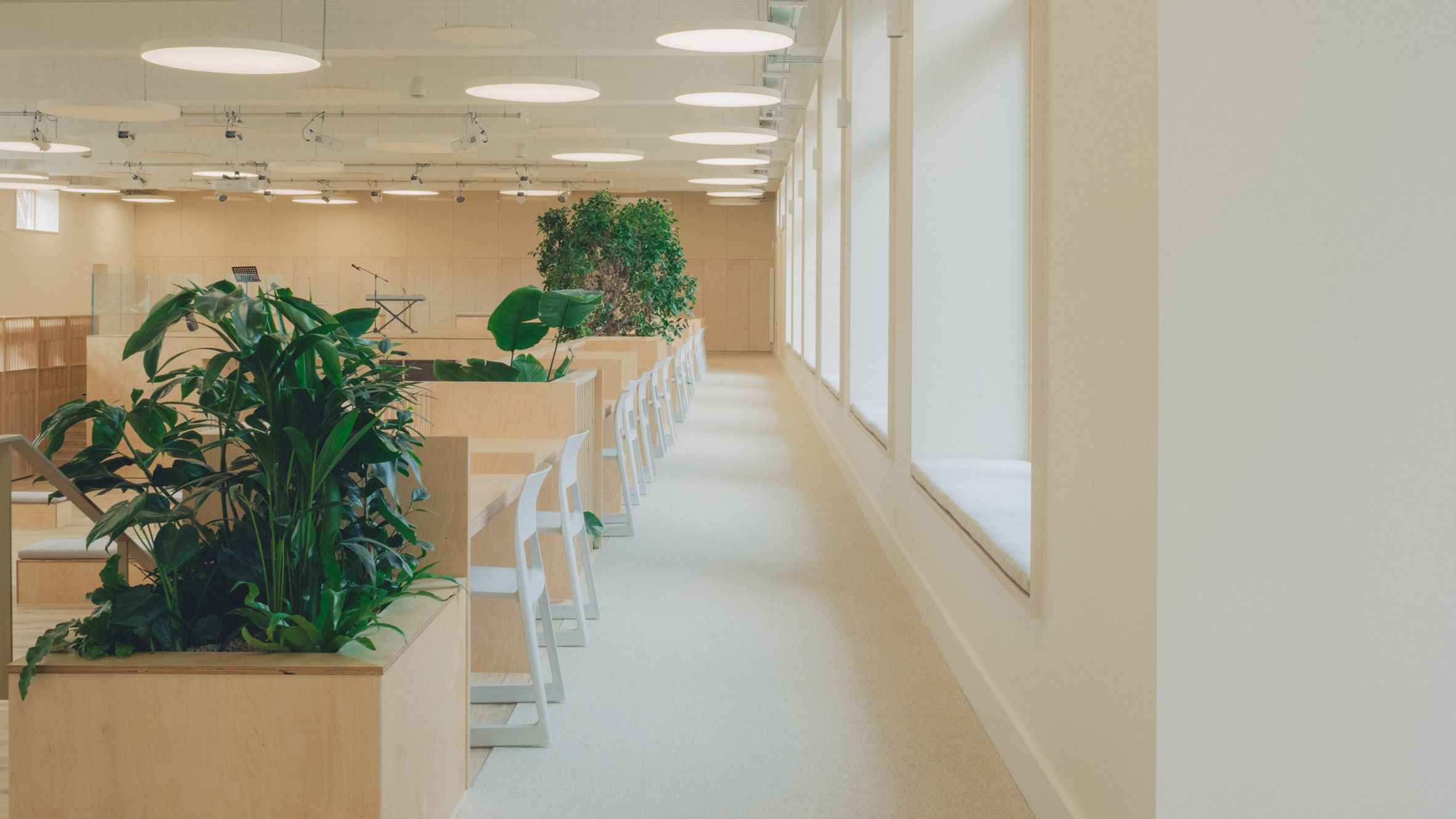 Natural light plays a key role in this renovation. The east and west-facing windows were enlarged to brighten the interiors, with seating built into the widened window bays to form cosy reading and reflection nooks. The material palette, guided by sustainability and longevity, features FSC-certified birch plywood, recycled acoustic panels and low-VOC finishes. Indoor plants are scattered throughout, softening the minimalist aesthetic and contributing to a biophilic atmosphere.