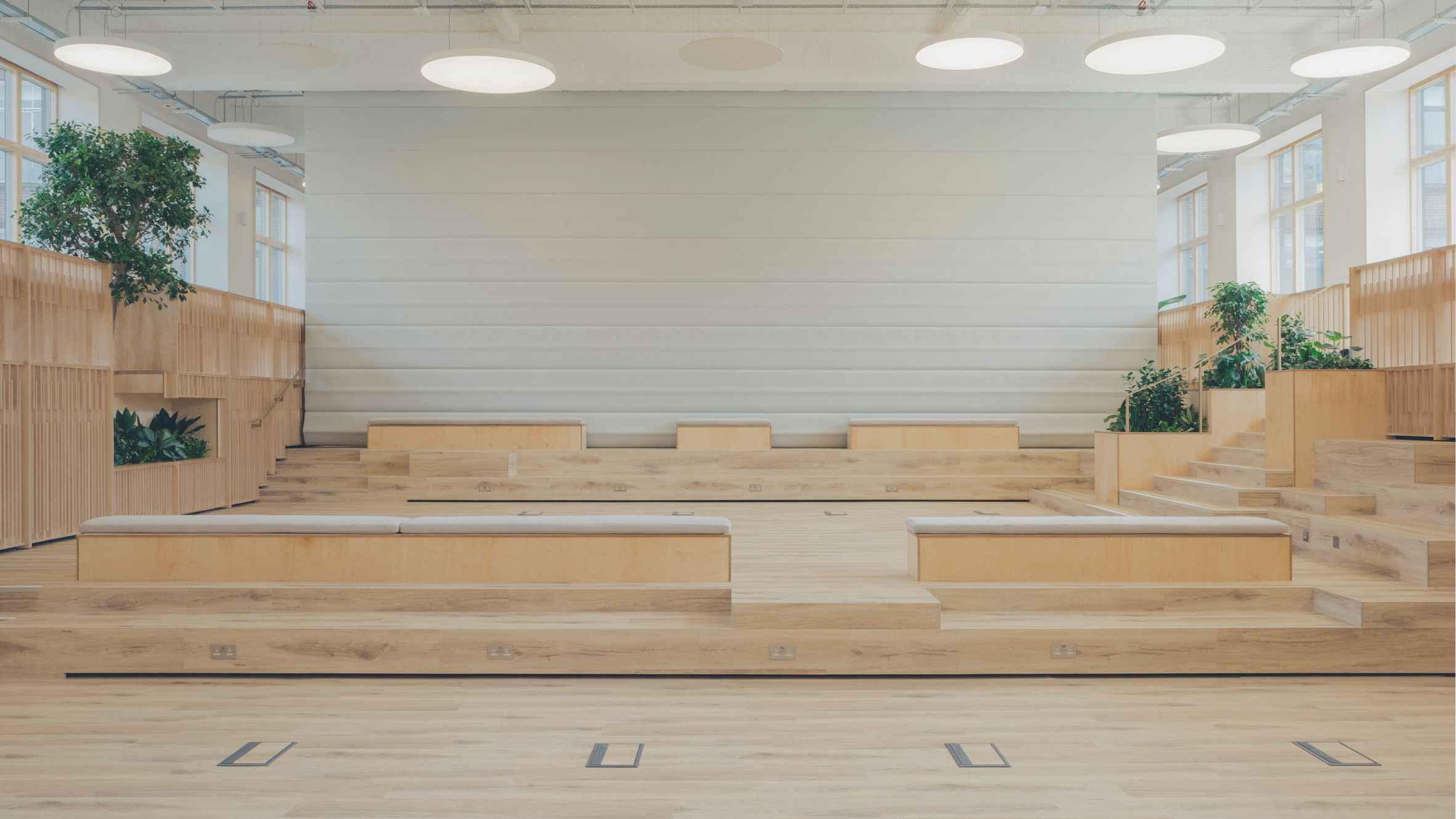 The material palette, guided by sustainability and longevity, features FSC-certified birch plywood, recycled acoustic panels and low-VOC finishes.