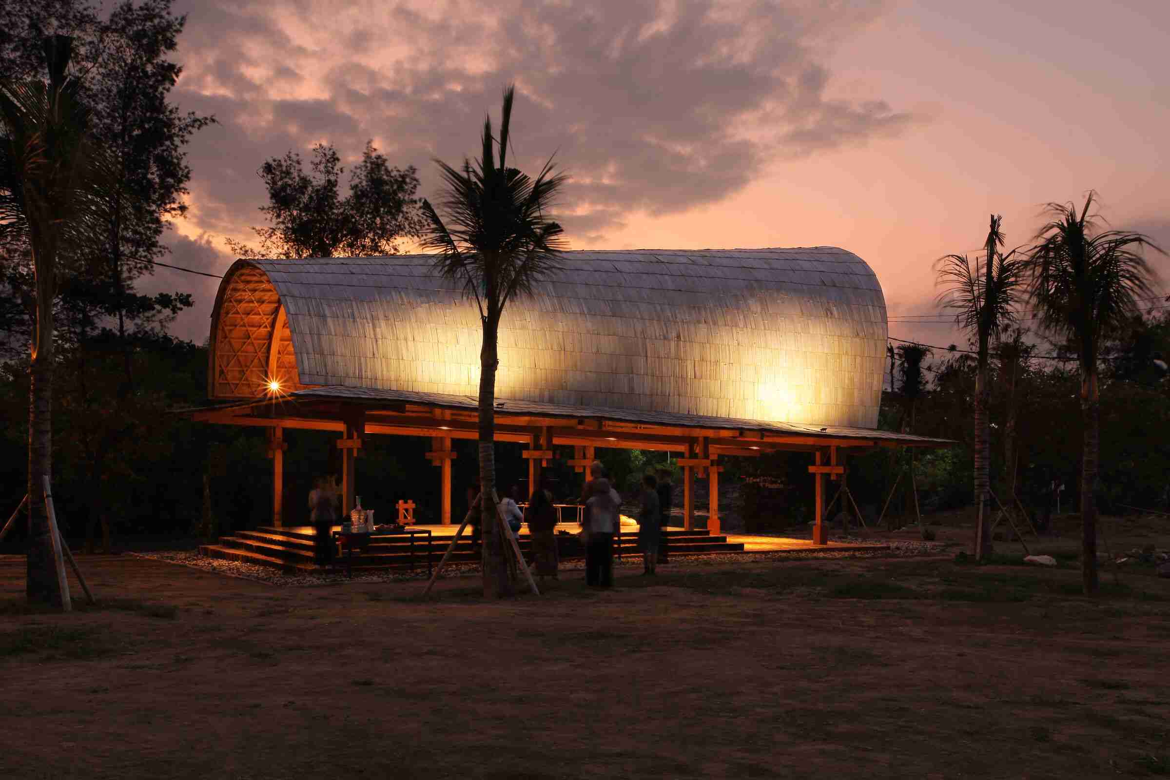 At the heart of the pavilion is a striking barrel-vaulted roof that reaches a height of 8.5m. This dramatic canopy, created from slender bamboo rafters and sheathed in pelupuh (flattened bamboo), gives the structure its distinctive outline. More than a visual treat, the roof is a climatic device. Its curvature and materiality encourages airflow and natural cooling, thus making mechanical ventilation unnecessary. Beneath the canopy sits a robust structural frame made from laminated petung bamboo. This material, locally harvested, resin-laminated and compressed, delivers performance comparable to steel or timber while avoiding the high embodied carbon typically associated with those materials.