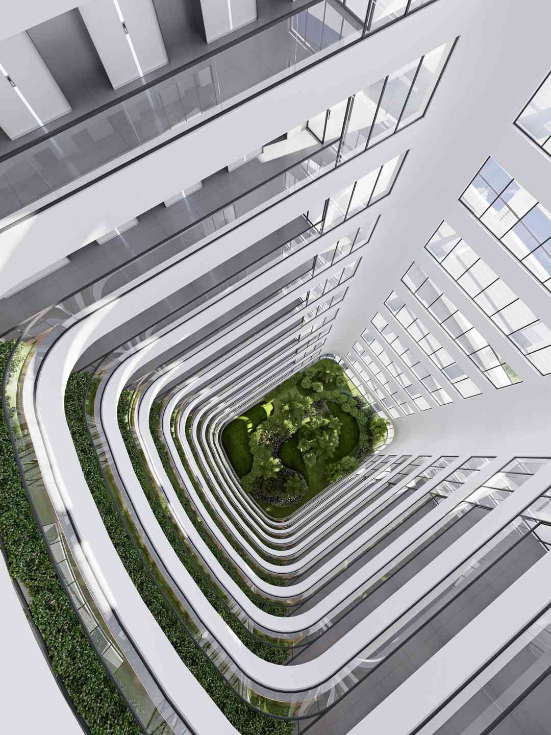 One of the tower’s social anchors is the green terrace at the third level, which opens into a soaring 107m high atrium.