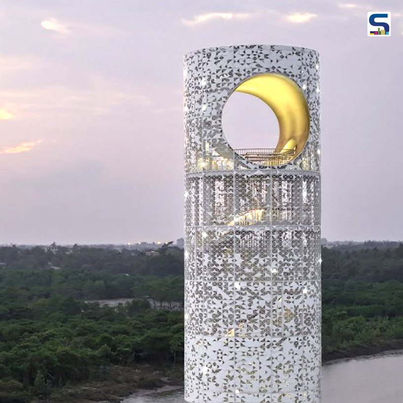 The facade of the tower employs low-reflective white aluminium panels arranged with perforations inspired by the organic shapes of mangrove leaves. This perforated skin not only gives the tower a textured, shimmering appearance but also helps reduce glare and visual disturbance within the habitat. The play between light, shadow and pattern becomes especially prominent at night through the project’s sensitive lighting design. Rather than brightly illuminating the structure, which could disturb wildlife, SCUTAD deliberately limited internal lighting and highlighted only the topmost viewing platform. Dotted lighting on the facade creates a subtle constellation-like effect, giving the impression of stars surrounding a luminous moon.