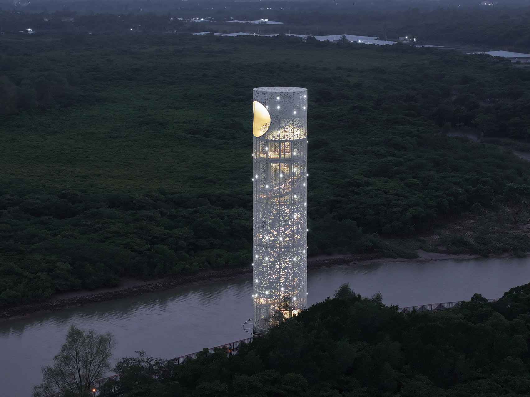 Rising 33.5m above, the Lunar Tower takes the form of a sleek cylindrical volume measuring approximately 6.5m in external diameter. SCUTAD designed the tower with the intention of capturing the quiet and serene presence of the moon. The moon is considered as an element that is deeply associated with cycles of nature and tides that also shape mangrove ecosystems. At the tower’s crown, a large circular aperture is carved out, echoing the image of a full moon. Inside this circular opening, the geometry thins into a delicate crescent-like profile, creating a subtle visual metaphor of a silver moon resting within the cylindrical form. This sculptural gesture defines the identity of the tower, thereby enabling visitors to experience the reserve through an architectural frame.