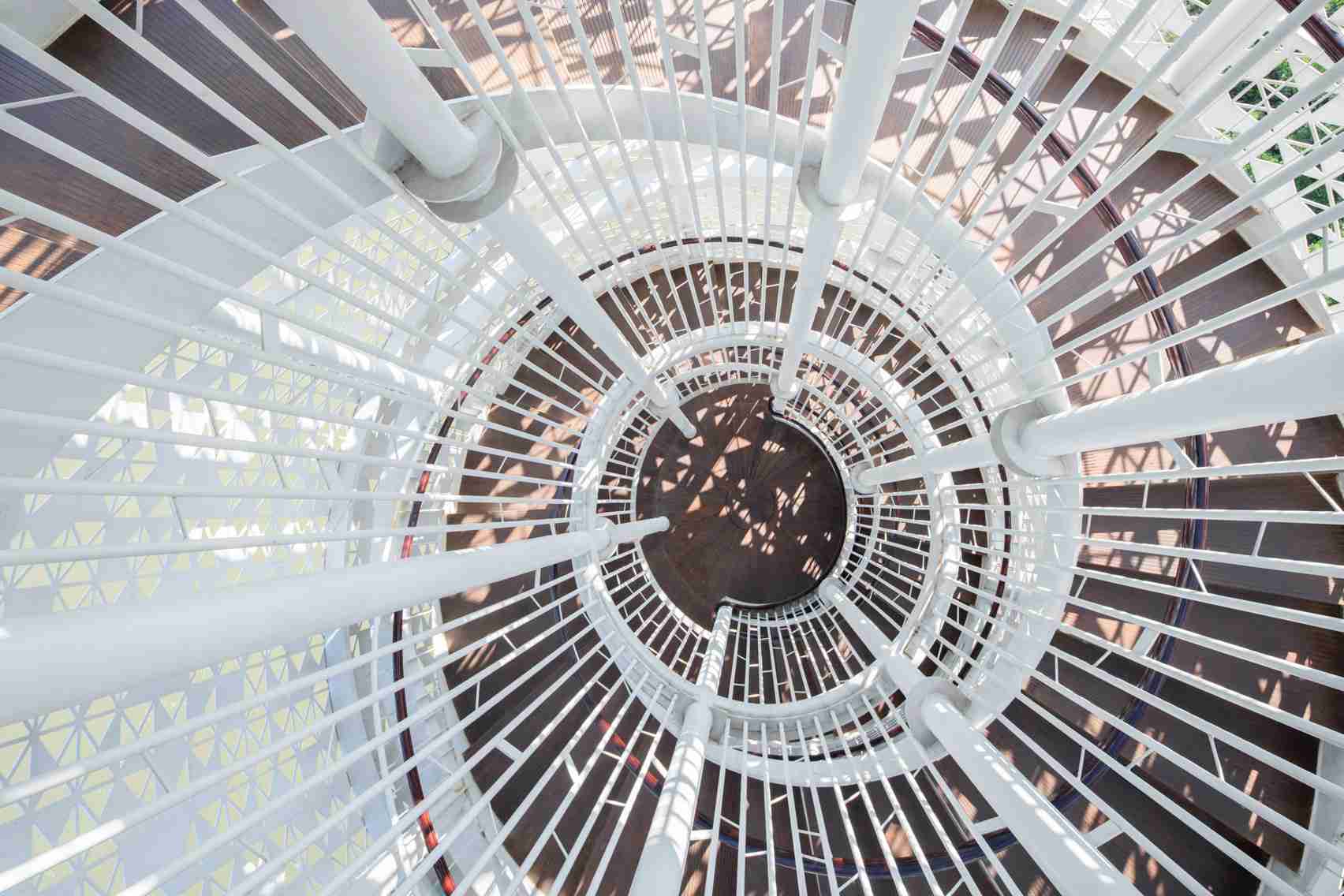 At the core of the tower, a spiralling staircase leads to three distinct observation platforms placed at different heights.