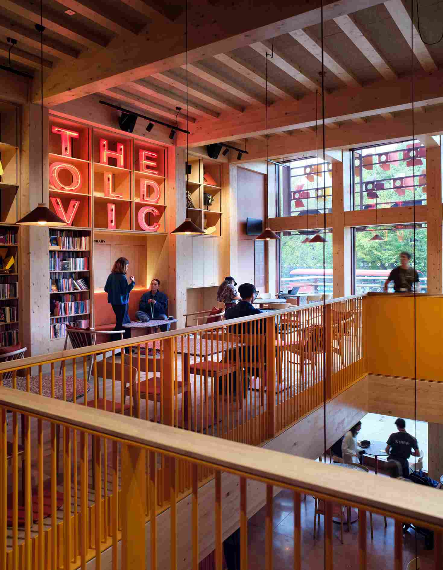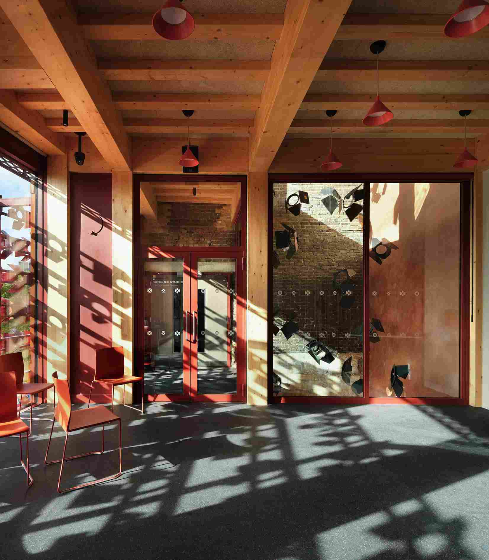 Surrounding this central hub are a variety of learning, rehearsal and creative spaces. These include studios for workshops and practice sessions, a dedicated script library and a writing room that supports playwrights and emerging voices. On the fourth floor, a flexible multi-purpose events space provides room for talks, performances and gatherings, with direct access to a compact roof terrace that offers a moment of outdoor break within the dense urban setting. Sustainability played a key role in shaping the project. While the glulam structure of the café was newly built, the overall design prioritized the retention and reuse of existing materials wherever possible. Many of the original walls were preserved, reducing demolition waste and the need for new construction materials. Acting as a brise soleil, the colourful external screen is made from recycled theatre spotlight shutters, also known as barndoors. These elements were salvaged, repainted in vibrant hues of red, yellow, orange and purple, and arranged in a striking, flower-like pattern that brings both shading and character to the street elevation. The result is a playful yet meaningful reference to the theatre’s technical heritage that is transformed into an architectural feature.