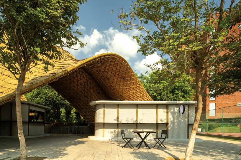 The facade and built elements are anchored by 3D-printed concrete kitchen modules, inspired by food trucks and executed by Micob Pvt Ltd, Ahmedabad. These modular units form a robust yet efficient frontage, with the additive printing process reducing material waste, energy consumption and construction time. The cavity walls of the printed concrete further enhance the facade’s thermal performance, thereby improving comfort while lowering heat gain. Hovering above, the defining visual layer is a bamboo gridshell canopy that functions as both a facade and a shading device. Curving in two directions, the bamboo shell mirrors the efficiency of folded leaves, achieving strength with minimal material. Spanning up to 19m, the structure comprises four layers of slender bamboo members laid at 45 degrees and f inished with crushed bamboo mats.