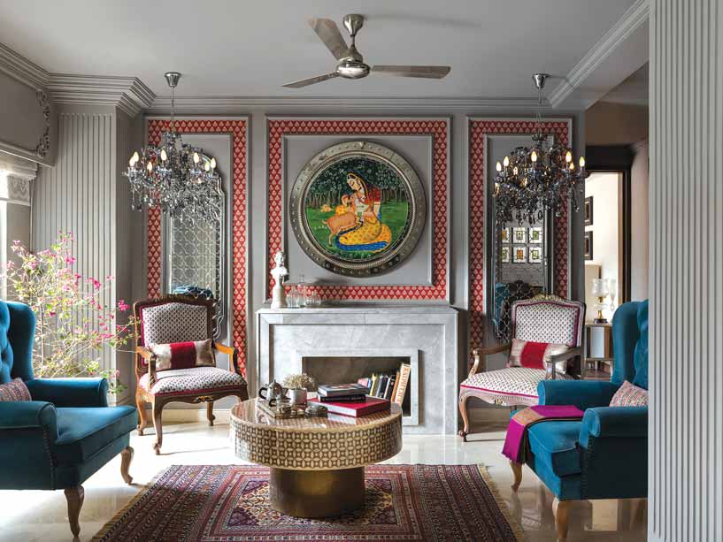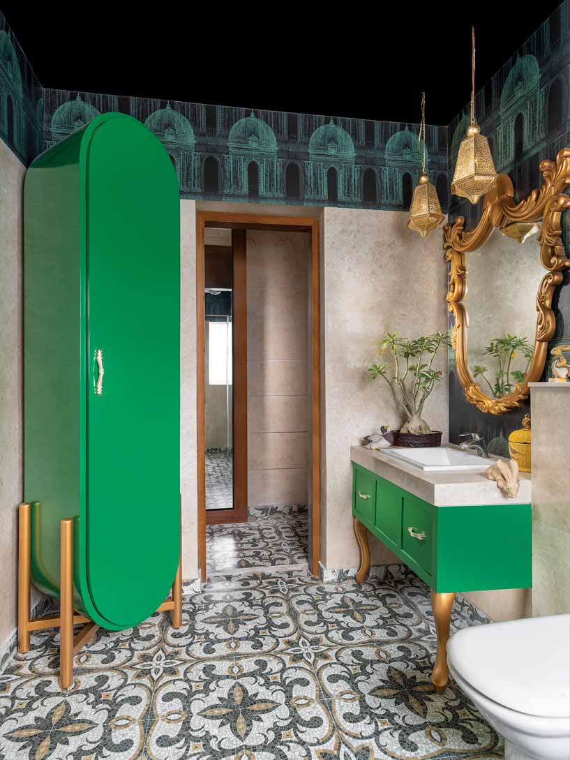 A standout material appears in the mirrored Jodhpur bar, where reflective surfaces amplify light and intricate carvings transform function into ornament. Bedrooms soften the palette with neutral hues punctuated by jewel tones, vintage f inishes, and warm lighting, while the master bath pairs patterned tiles with a freestanding tub for a spa-like retreat. Extending outdoors, including the terrace, further blends artisanal furniture with greenery.