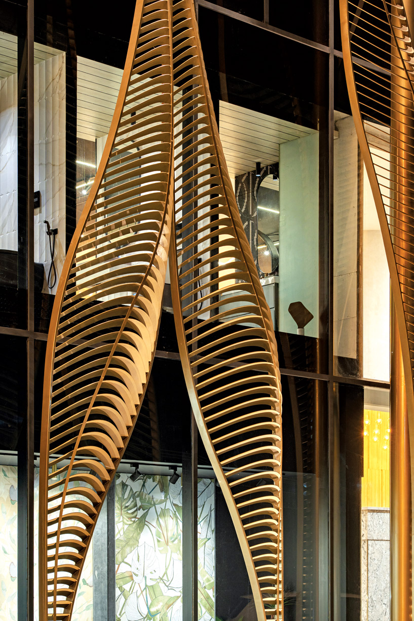 One of the greatest challenges was the transformation of an existing Mercedes-Benz showroom into a marble display centre. The original structure consisted largely of a flat glass façade, which had to be completely reimagined. To achieve the organic language of the new design, a parametric façade inspired by the form of overlapping leaves was introduced. This required extensive steel fabrication and precise coordination during installation.