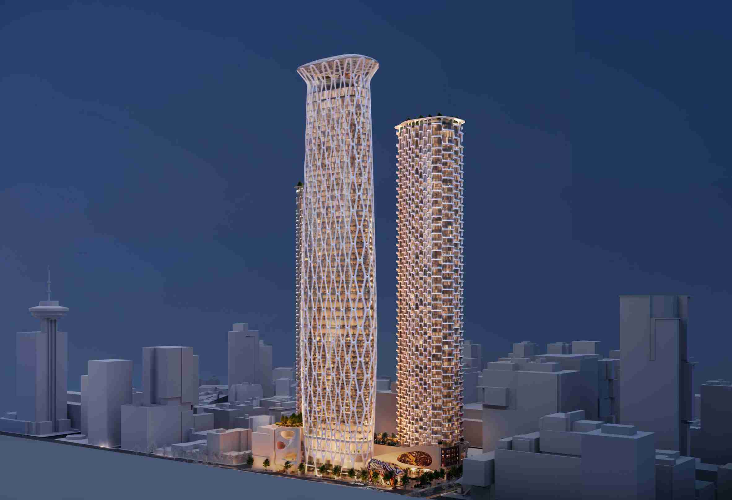 The tallest of the three towers, addressed at 595 West Georgia Street, will soar to an impressive 1,033ft, or approximately 314m, upon completion. Its exterior is conceived as a striking fusion of engineering and natural inspiration, wrapped in a steel exoskeleton clad in white Glass Fibre Reinforced Polymer (GFRP) panelling and enveloped in highly translucent expanses of glass. The design language draws inspiration from the rare and ancient glass sea sponge reefs found off the coast of British Columbia, which are living underwater formations that embody both structural resilience and environmental adaptability. According to Henriquez Partners Architects, the visual identity of the tower is also oriented towards achieving net-zero carbon operation.