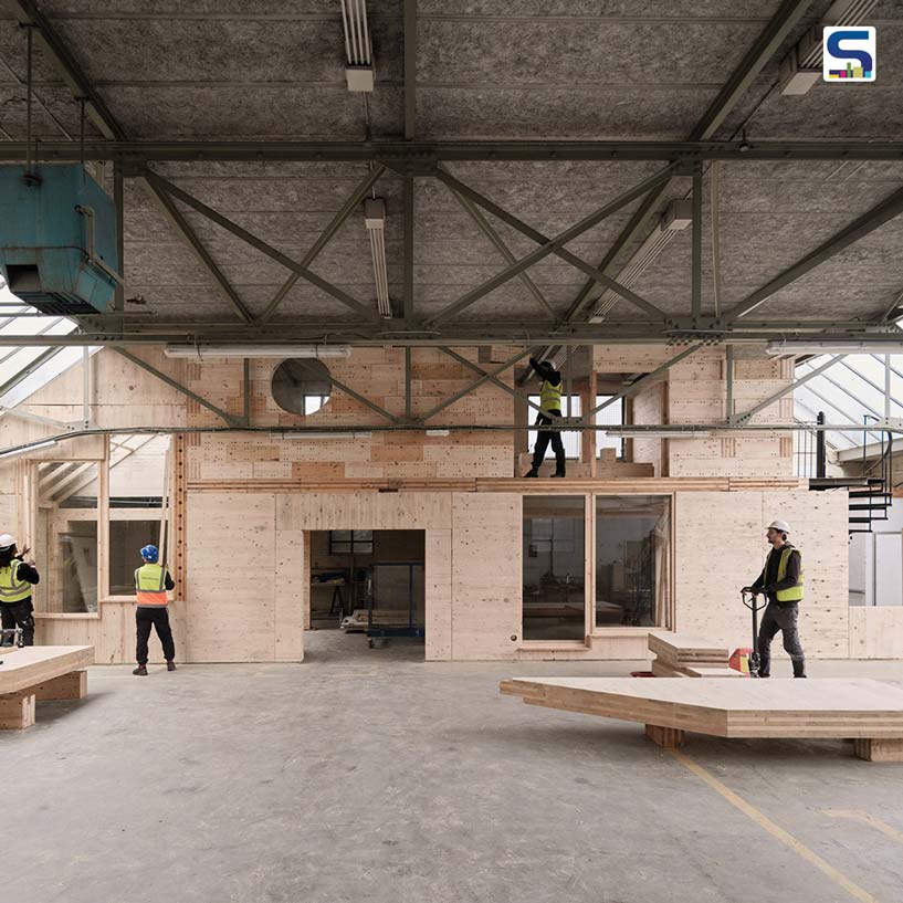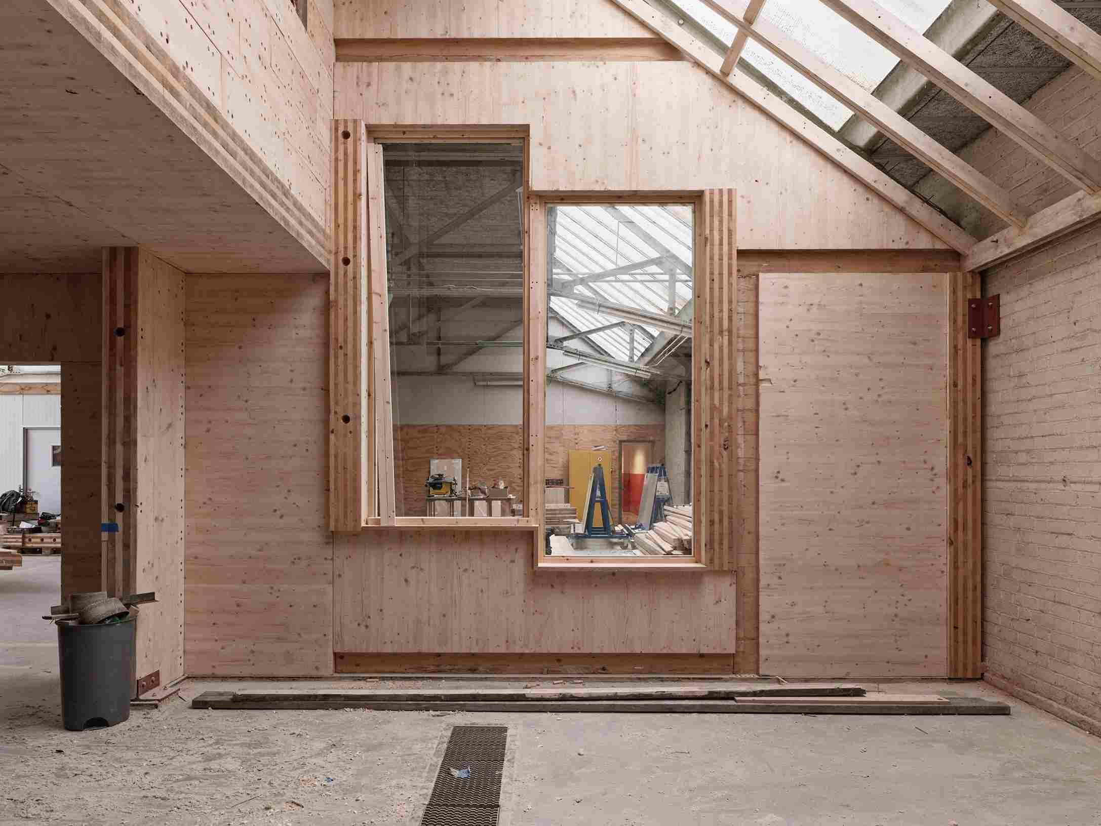 The hub includes a community workshop, event and training spaces, an electrical testing facility, a collective office environment, a materials store operated by Resolve Collective and an assembly space capable of accommodating large-scale group construction builds.