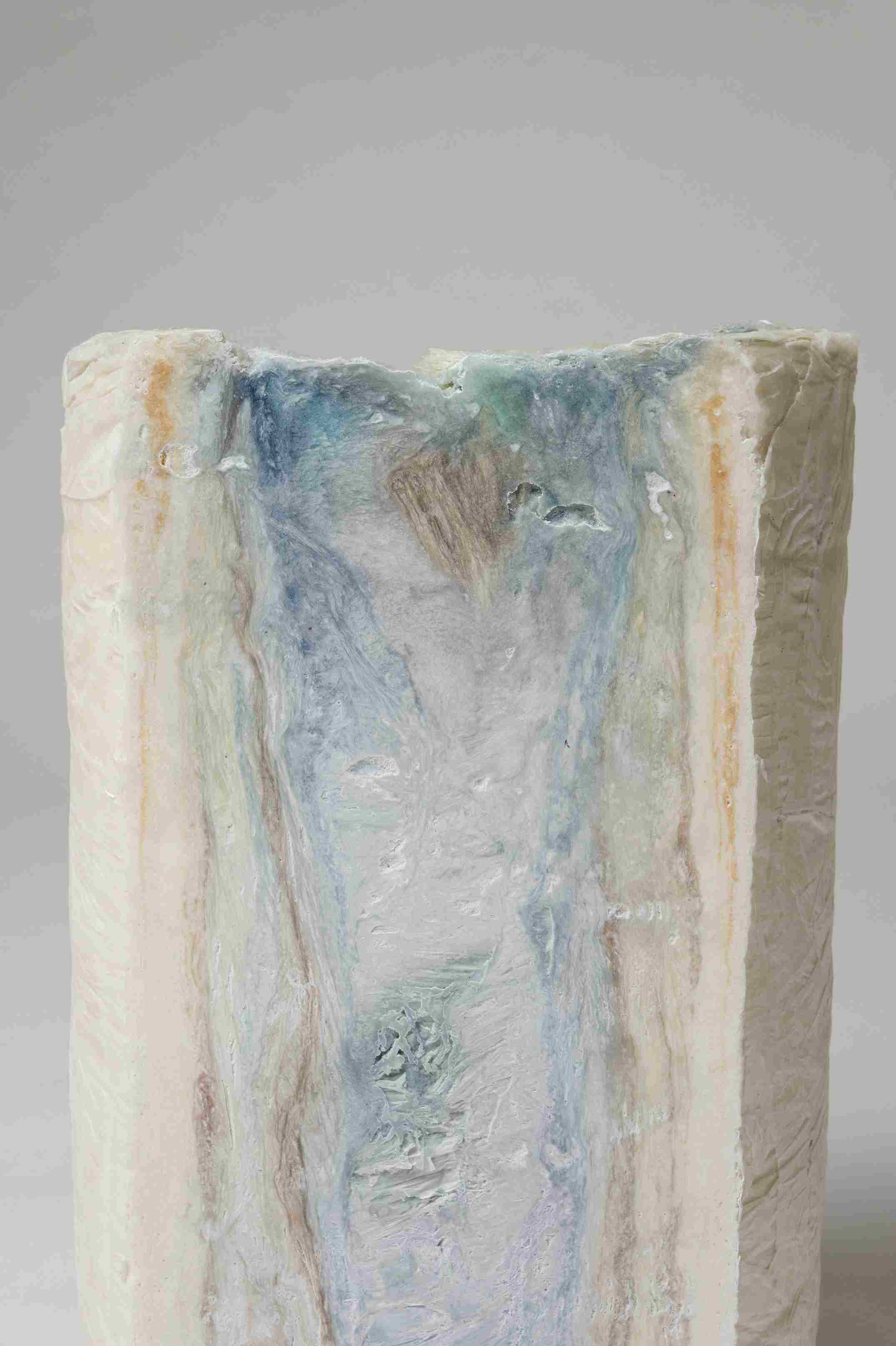 The approach to working with the paper logs drew directly from traditional woodworking techniques. The rolls were carved, sawn, peeled and unrolled in much the same way a craftsperson might work with timber. Given that paper is inherently more porous and less structurally rigid than wood, the material required additional treatment to achieve durability. Hence, pieces were either soaked in wax or bound together with adhesive to consolidate and stabilise the compressed sheets.