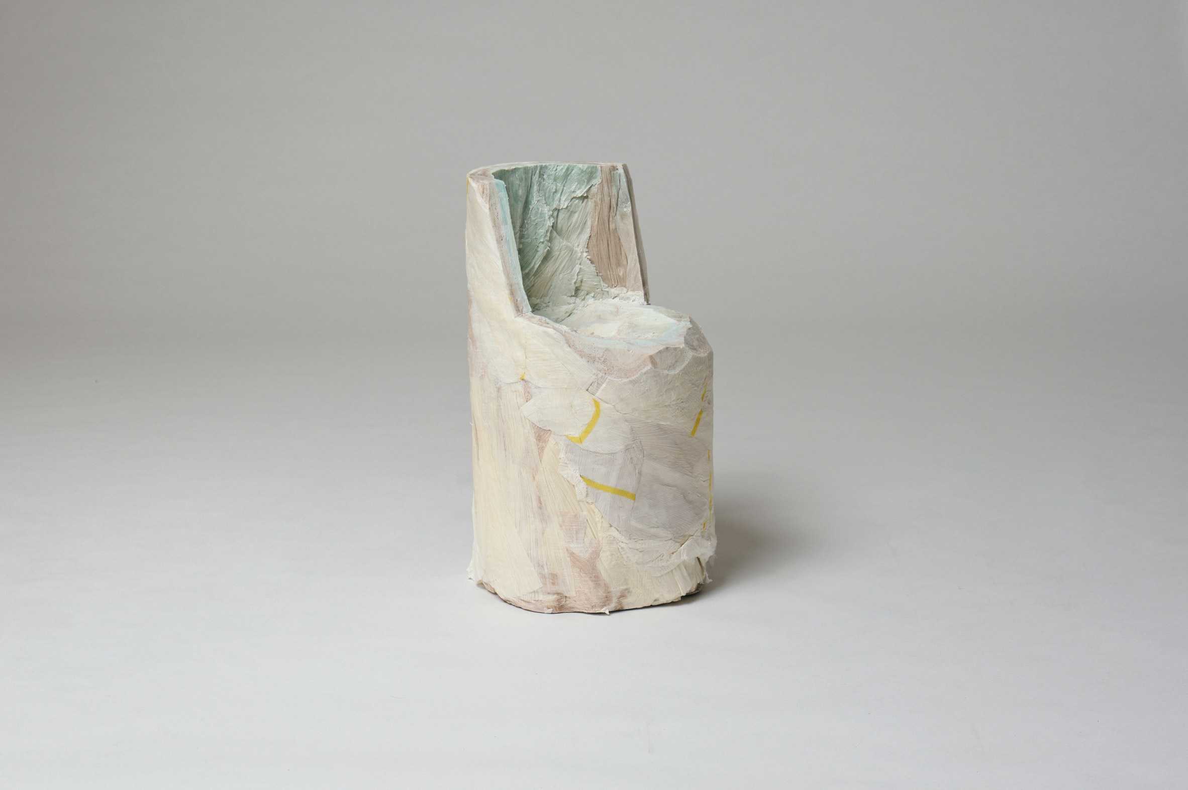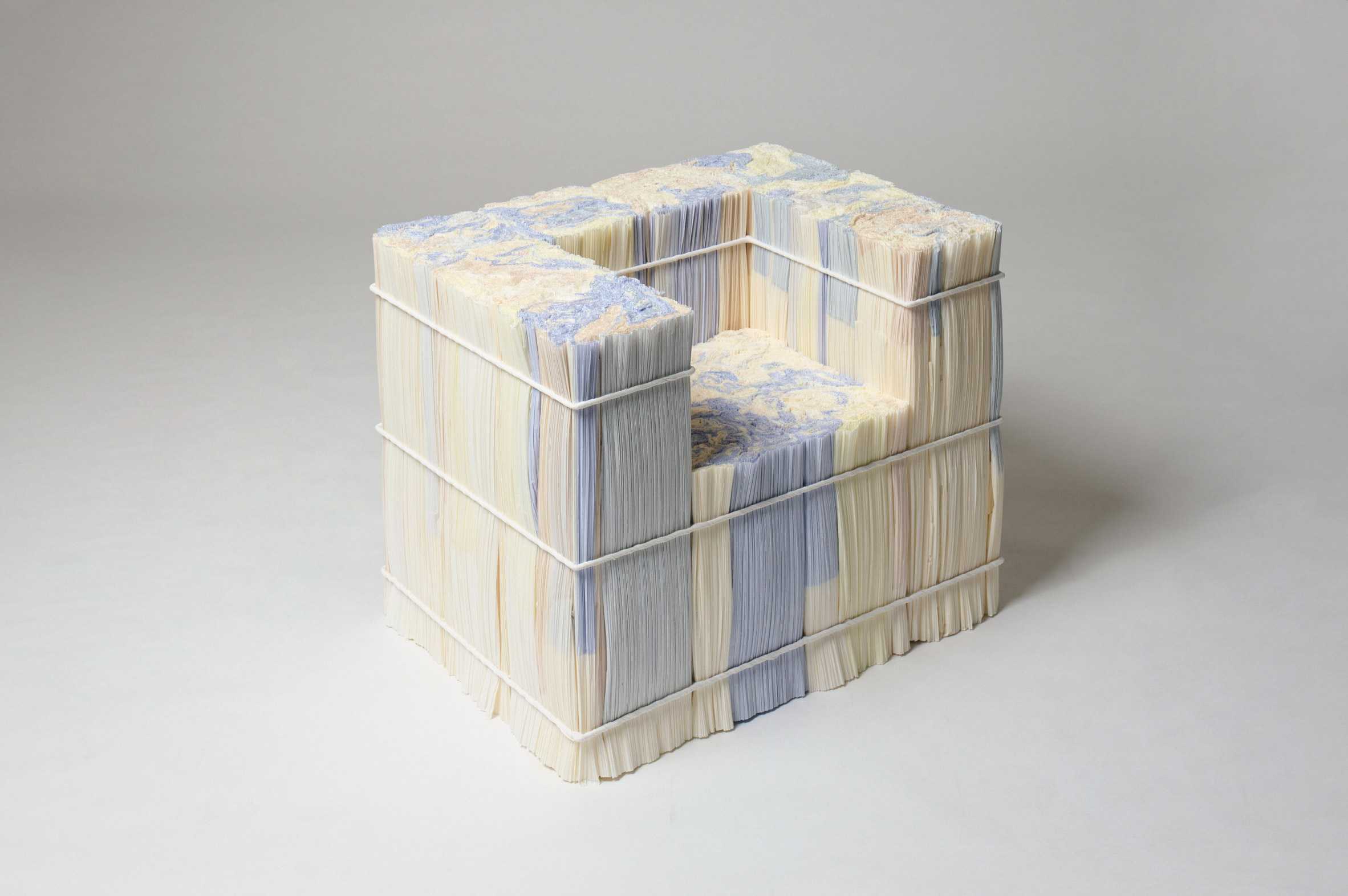 The collection also features a substantial blocky armchair, constructed from sheets of waste paper arranged to produce fluted sides and a mottled cross-section.