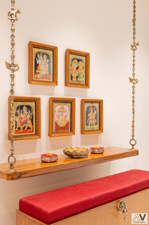 The Pooja room was designed keeping the small space in mind. To keep it simple and minimalistic the storage was planned in the ottoman. The brass chain and solid wood slab completes the frame of Tanjore paintings.