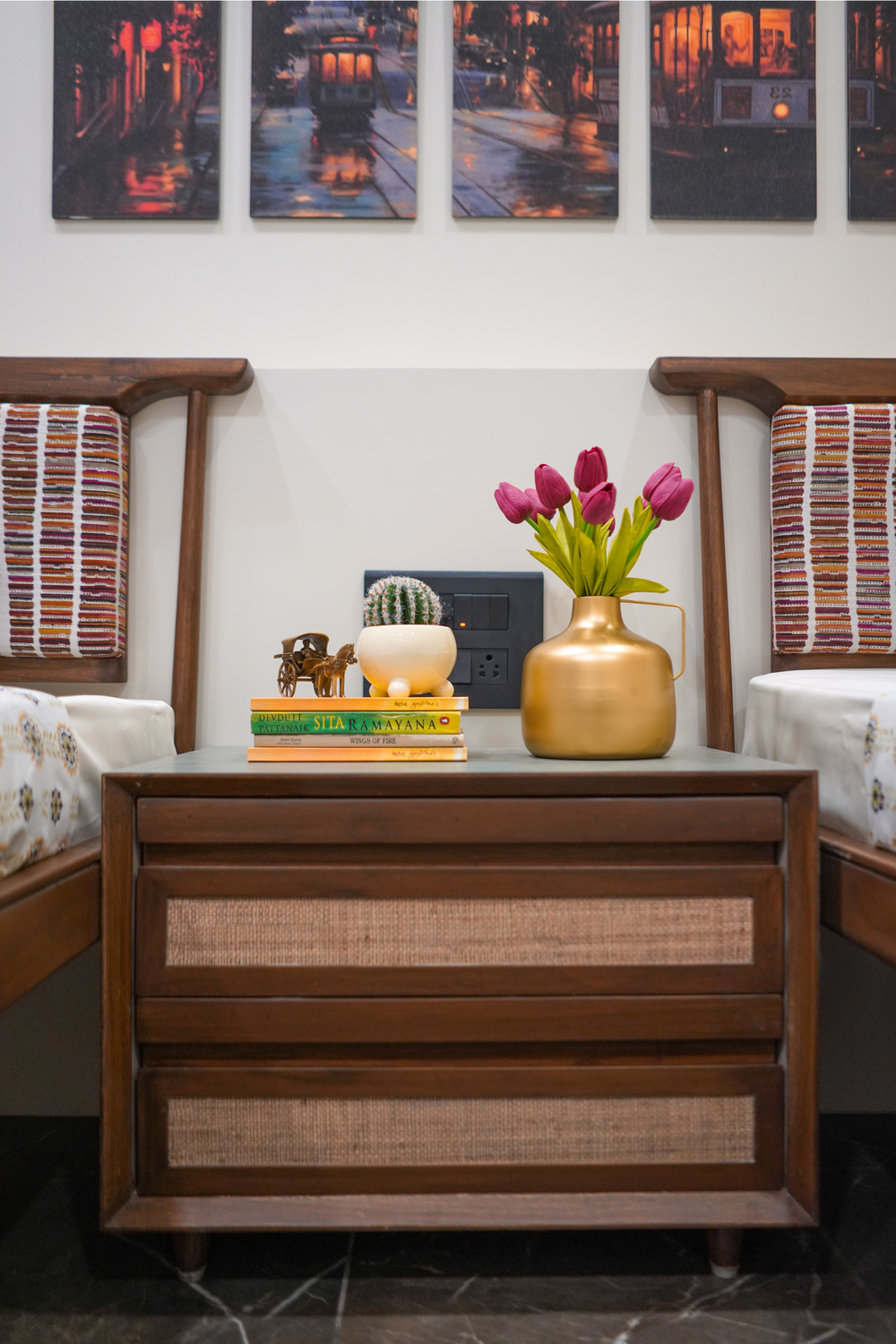 Total furniture combination for this room was done in solid wood, which reflected mid-century style. They had further used laminate that looked like rattan for easy maintenance for elevating the look of the wardrobe, console and night table.