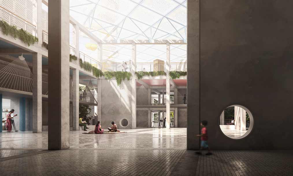 Slated to be fully constructed by February 2023, Studio Saar’s proposal for the Third Space draws inspiration from traditional havelis where spaces are organised around a central courtyard. Located on Baori Street, the four-storey space is a flexible exhibition, performance and meeting space that is surrounded by gokhra and jali screens. A 6m-high sliding door will welcome visitors into the main central courtyard which will be spread around to provide clear routes to all the learning and activity spaces. The courtyard will be surrounded by cloisters that will be kept cool through extensive use of thermal mass. Trees, sourced from traditional urban Indian contexts, will be positioned internally to act as wayfinding for visitors. A formal arrangement of projecting gokhada on the building envelope will draw people to the building edge and provide small, playful cantilevered rooms for reading, meeting and relaxing.