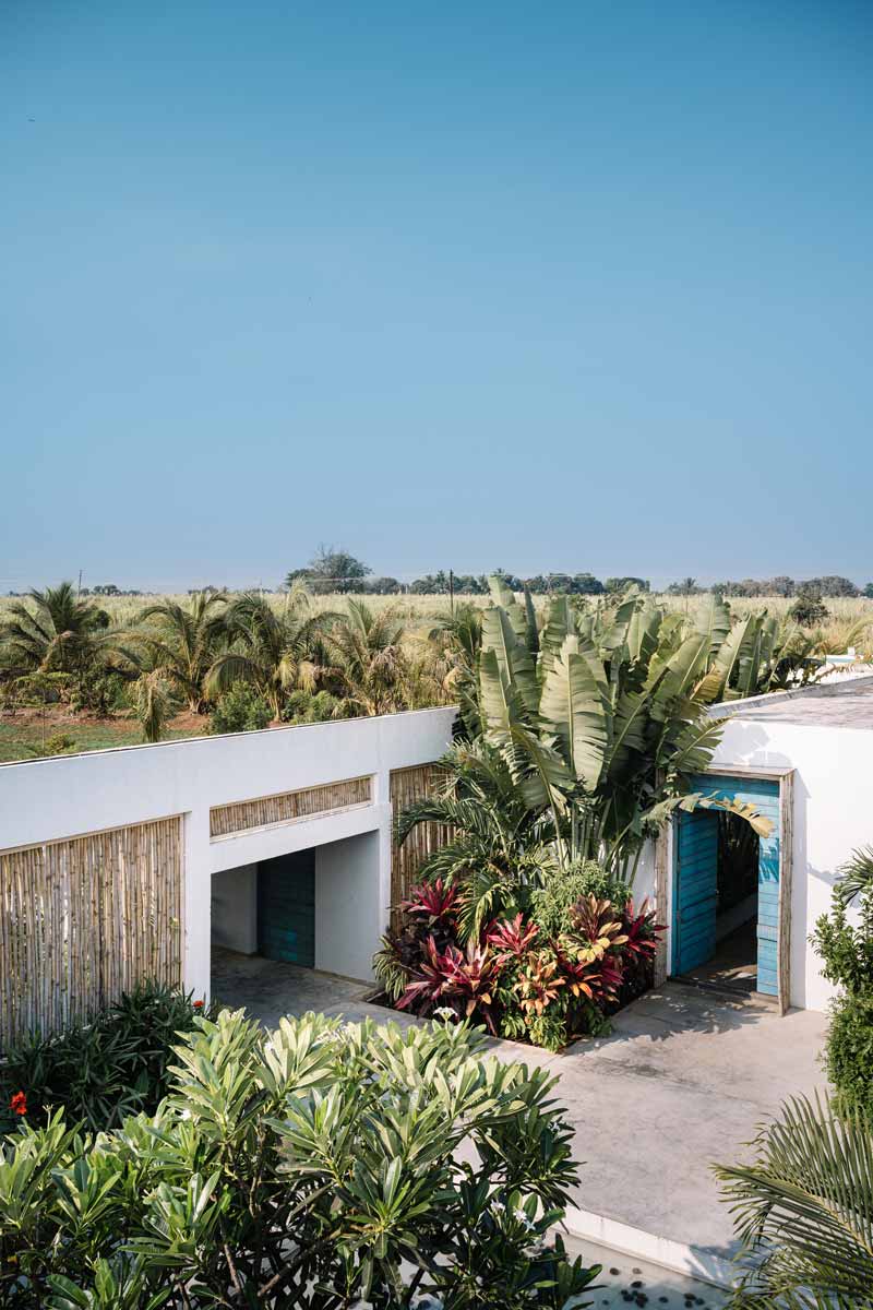 The façade reflects minimalism, while the scale and details of the built-form resonate optimism as one walks down the unpaved contours of the house. Opening the west-facing blue wooden door, one feels welcomed by a low-height foyer embraced by an open courtyard.