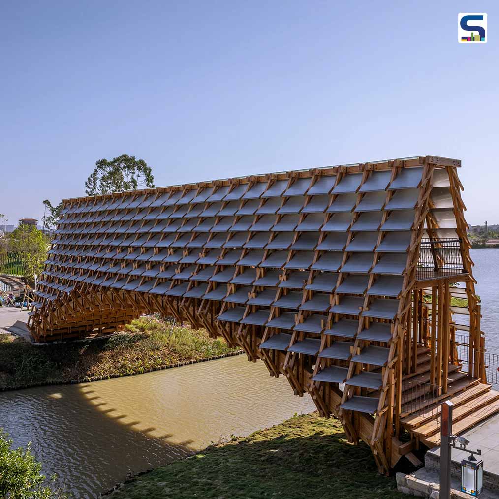 Then, metal plates are inserted into the wooden framework which offers shade and helps in natural rainwater drainage. This results in a complex structure that not only offers a spacious walkway across the water but also provides shelter to those crossing.