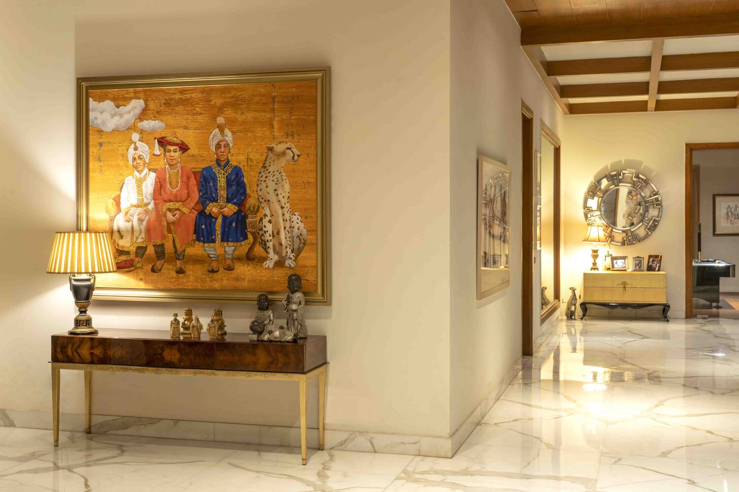 The ceiling has been covered with gold leafing and a custom-made chandelier looks magnificent. The glass windows allow for uninterrupted views of the drawing-room and bar pavilion. Orchestrating movement through space, the Victorian-style silver furniture with elaborate carvings makes an interesting addition to the entrance foyer. The Thota Vaikuntham painting with bright colours embraces a rich variety of spatial experiences.