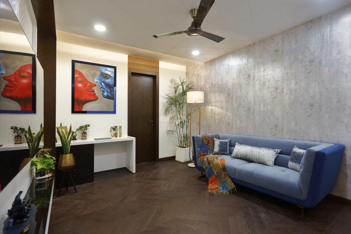 As we go deeper into the apartment, attached to the father’s bedroom is the elder son’s bedroom. Instead of having an elementary ceiling, the PoP and veneer have been incorporated to create detailed grooves. The bedroom has two sections - each with its distinct functions.