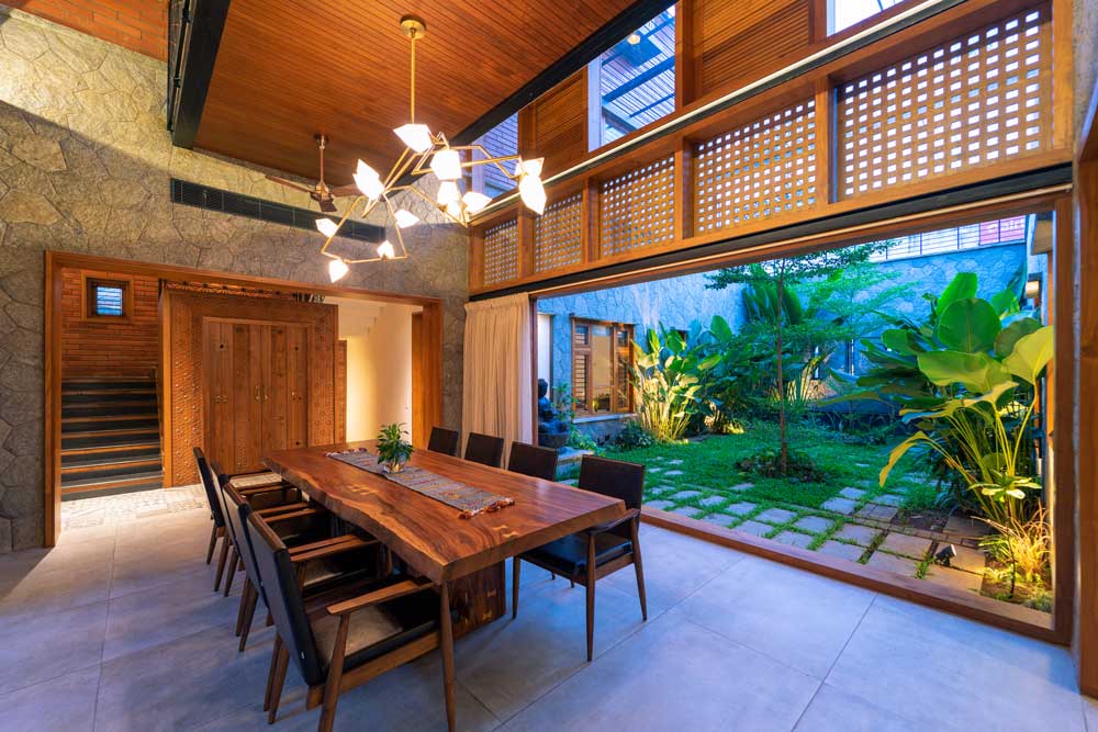 The dining space, located in between the two courtyards, connects the two built zones. Togetherness and bonding are fostered by this comforting setting of the dining room.