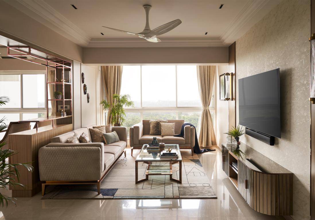 The use of a mirror panelled wall helps open up the narrow entrance foyer considerably. It also reflects the sunlight that pours into the living area, giving the illusion of vastness. The living room exhibits a beautiful amalgamation of modern sophistication with a touch of the classic Art deco style in terms of detailing and geometry. One can catch sight of the crown moulding that runs throughout the periphery which also continues around the doorways. A passage door having fluted glass panels detailed with rose gold handle adds to the contemporary nature of the space.