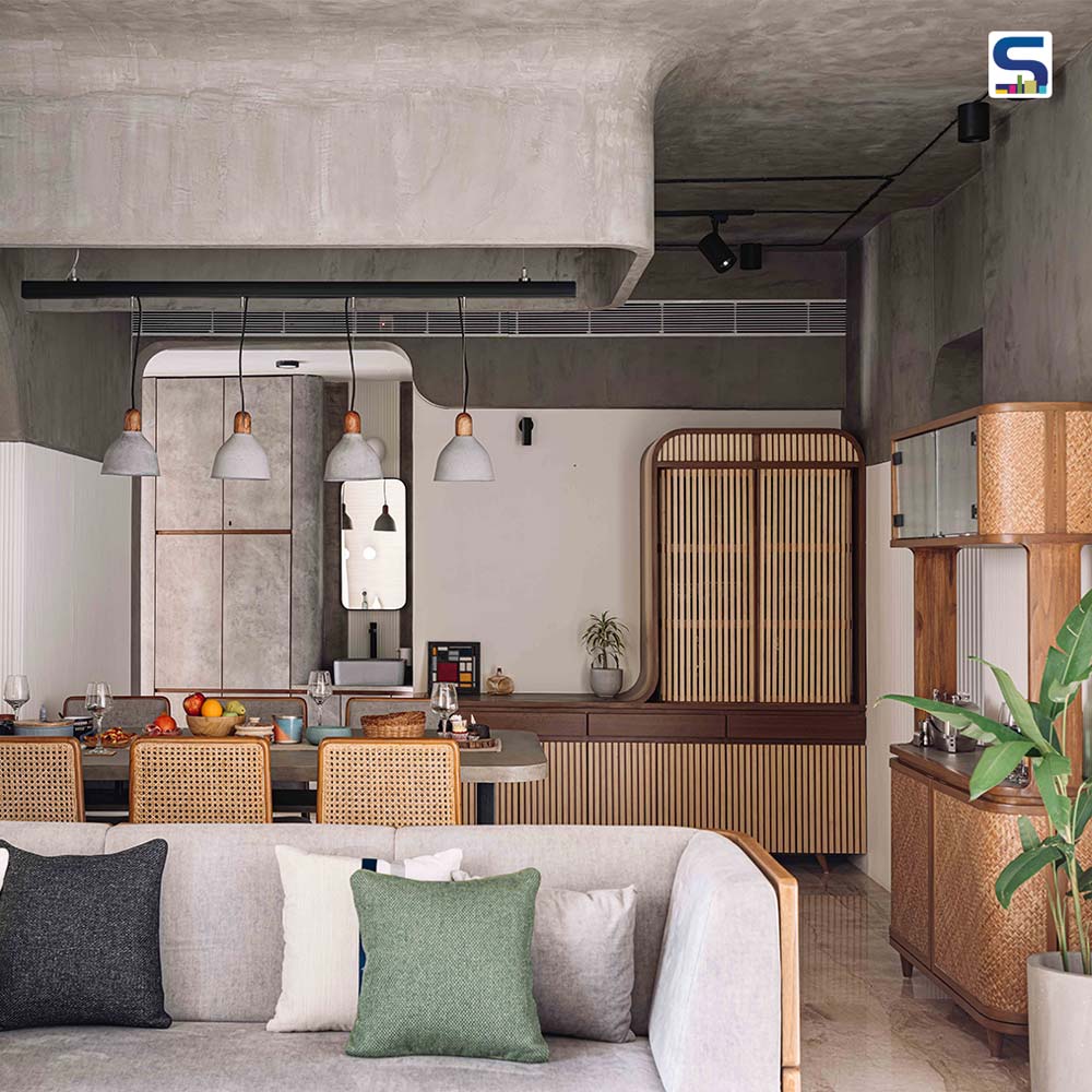 The 1,531-square-foot, four-bedroom apartment in Ahmedabad, Gujarat is fashioned by Jeet Soneji, Founding Principal of Jetsons. The home is an amalgamation of three major elements, Curve, Concrete and Lines, which are repeated throughout the house in various mediums in terms of material palettes, texture, edges and finishes. Curves are used to replace the perpendicular edges with soft rounded surfaces, concrete is used as a base material in different forms to tie the house together and the repeating line detail is used as a binding element throughout the house. Concrete, cane and wood of different textures are used on the ceilings, walls and furniture pieces to show a relation of materials in various forms. “The key idea of this curvy concrete apartment is to create a flow-through of these diverse spaces of materials and furniture which compliment each other in a minimalistic manner and bring the space to life,” tells Jeet Soneji to SURFACES REPORTER (SR). Delve into the design nuances of this home to get ideas for your home decor.