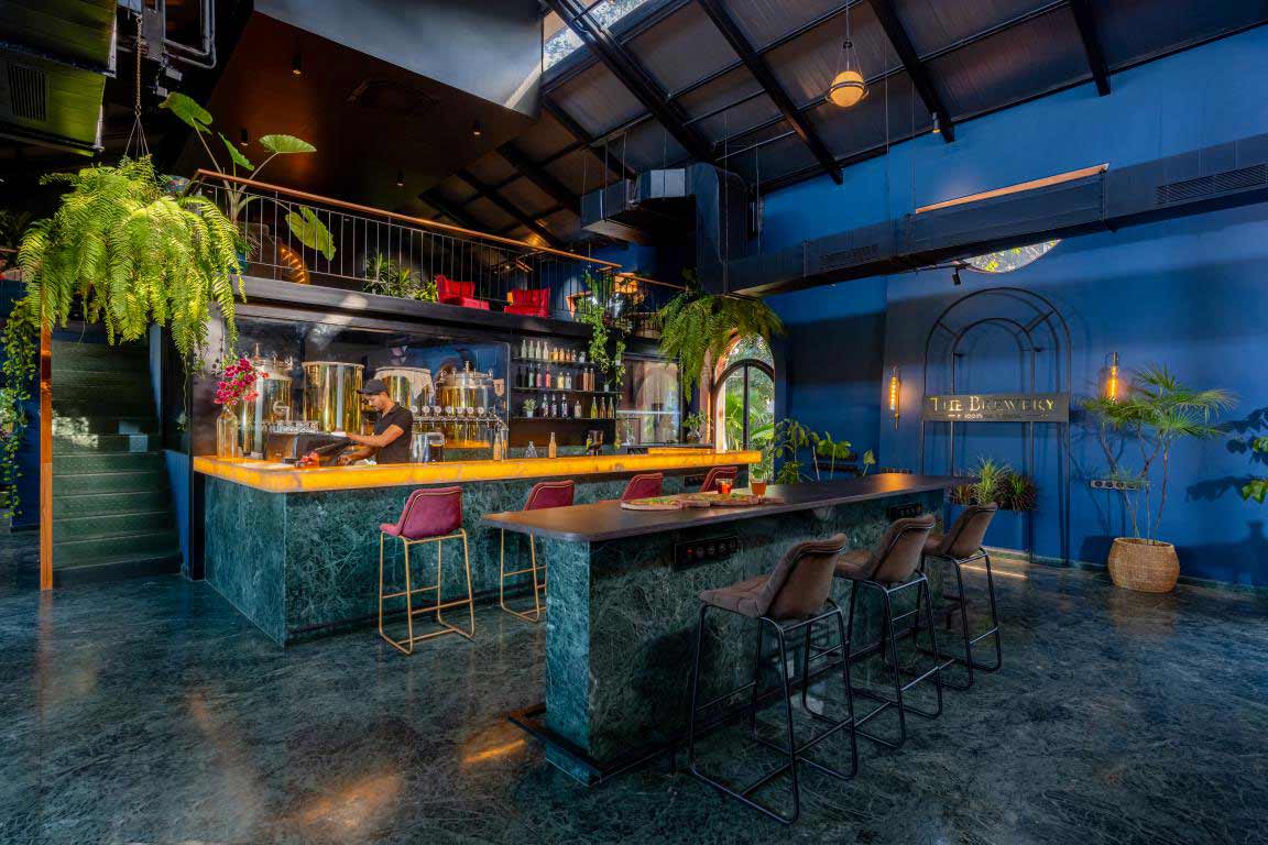 All across the Brewery's walls, the pervasive shade of Prussian blue creates a cool backdrop for the dance of light and shadows through the skylight and arches. The city's namesake marble, the Baroda Green, is an exquisite choice for flooring, adding velveteen feel to an ambiance soaked in nostalgia.