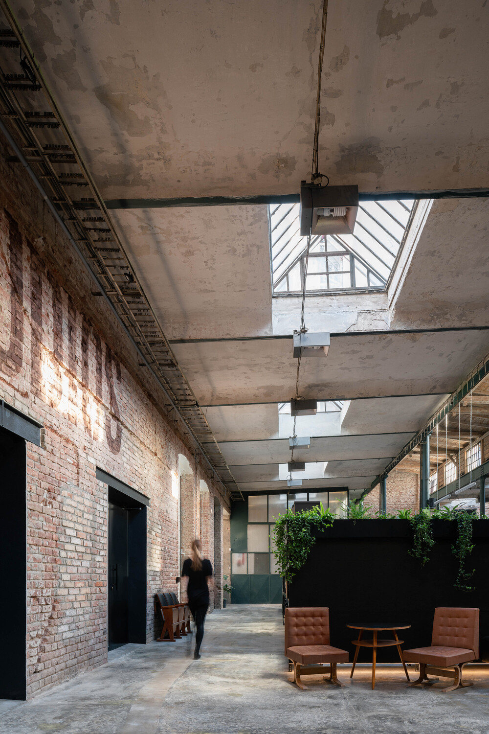 This is a new concept for what the post-production and music recording environment could look like: studios that connect an authentic industrial aesthetic with natural elements of light that beam through large skylights and well-placed glass partitions. All while the restored brick walls of this former factory not only work perfectly with the acoustic requirements of a modern recording studio but completes the space beautifully.