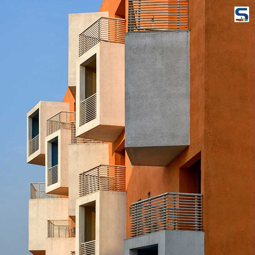 The colourful design approach with boxy balconies and recessed windows makes the residential building stand apart.