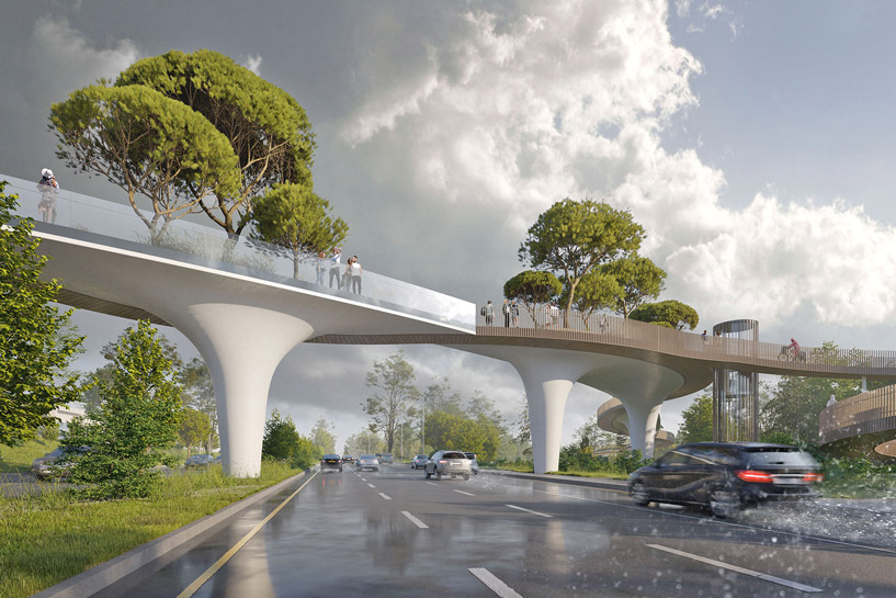 Nature envelopes the bridge with growing trees along its entire length that are part of the bridge, thereby creating the look of an elevated garden.