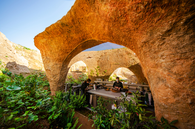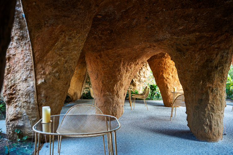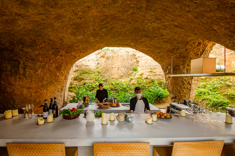 Glass panes were cut and installed inside the façade’s arches precisely to allow diners to enjoy the delightful views of the hole’s excavated earthen walls and several plants. The residential part of the project contains a kitchen, bedroom, a conversation space and a bathroom. The kitchen area is located on a long concrete island which hides it from view while serving as a bar.