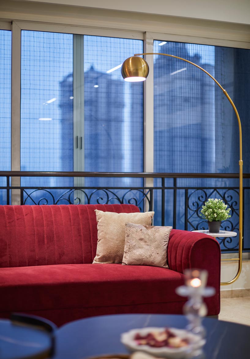 The maroon-coloured sofas complimented the tropical tones used in the space. They continued the mint tone on the grooved TV unit that subtly added to the verticality of the space. The tactile natural of the tear–dropped marble centre table gives an organic touch to the luxurious background.