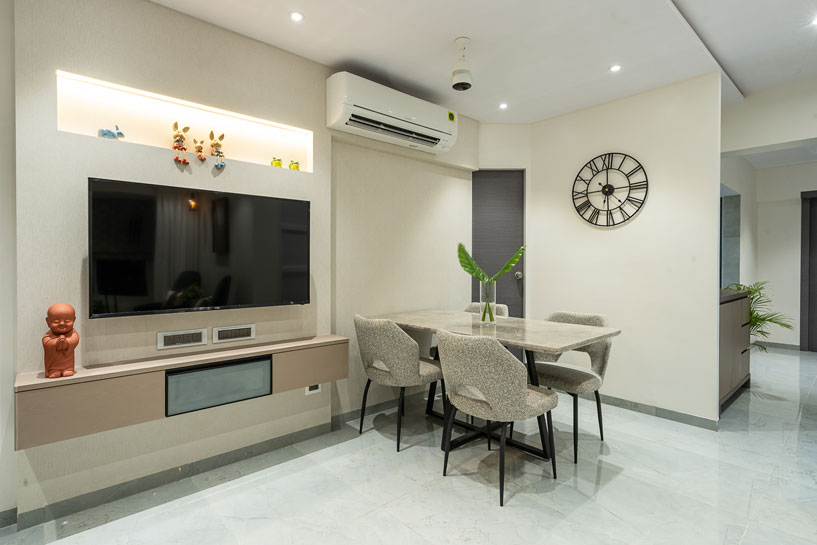 The left of the entrance is reserved for the dining area and TV unit. Blending with the beige backdrop, the modest dining table is the ultimate for all the cosy table conversations with lots of gossip.