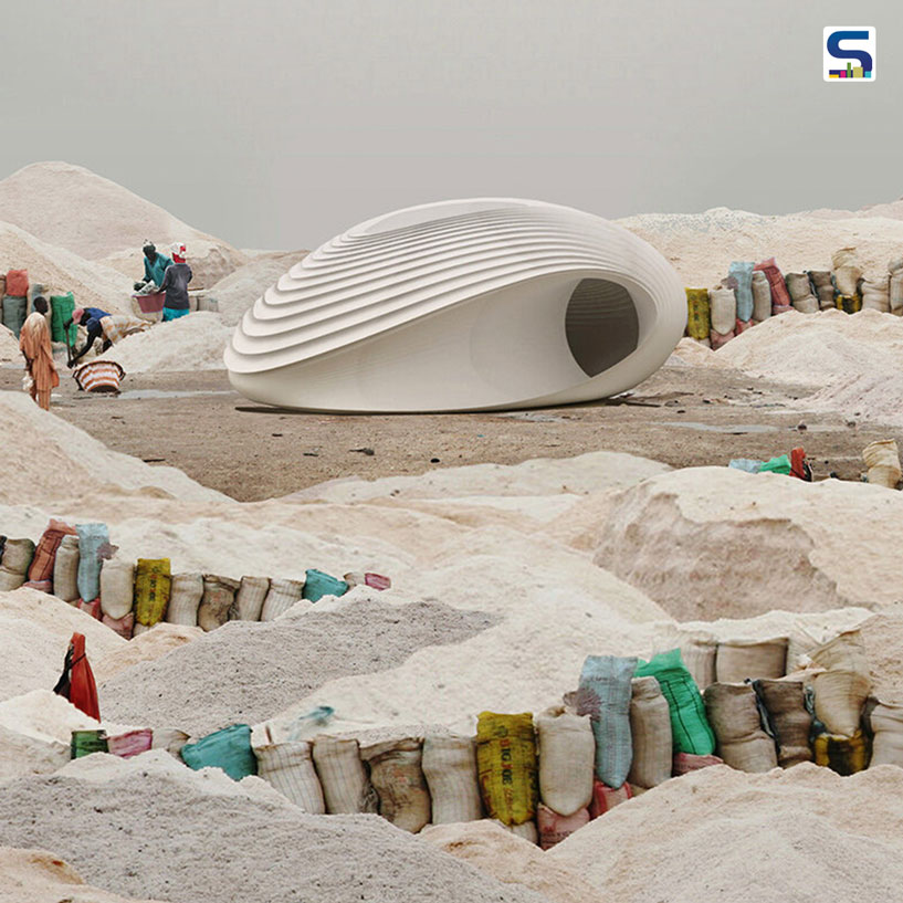 The shell-like design draws its impetus from conversations between Hassell's head of design, Xavier De Kestelier, and the founder of Nagami, a 3D-additive manufacturing studio - Manuel Jimenez Garcia. Its purpose is to make use of plastic refuse as a building resource.