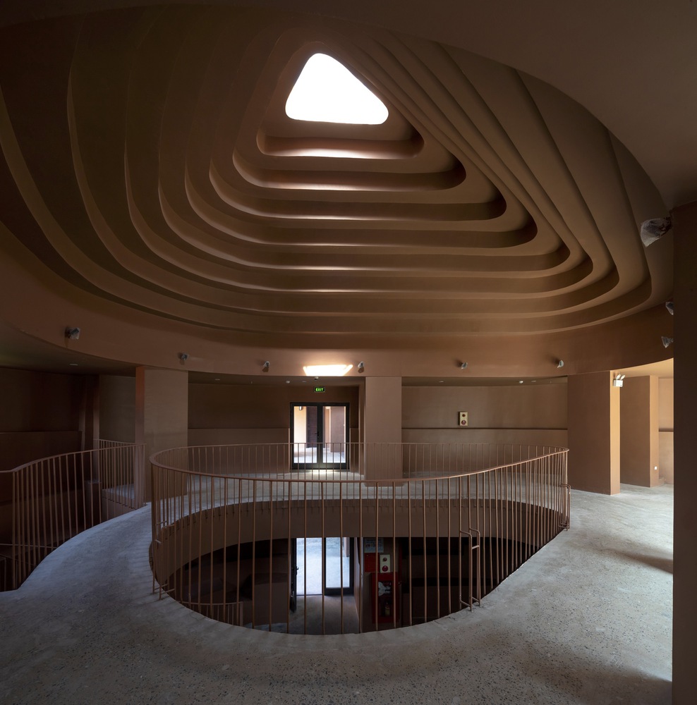 The museum's exterior showcases a mesmerizing view reminiscent of potter's wheels. Patterned skylights illuminate the walls constructed with local clay bricks.