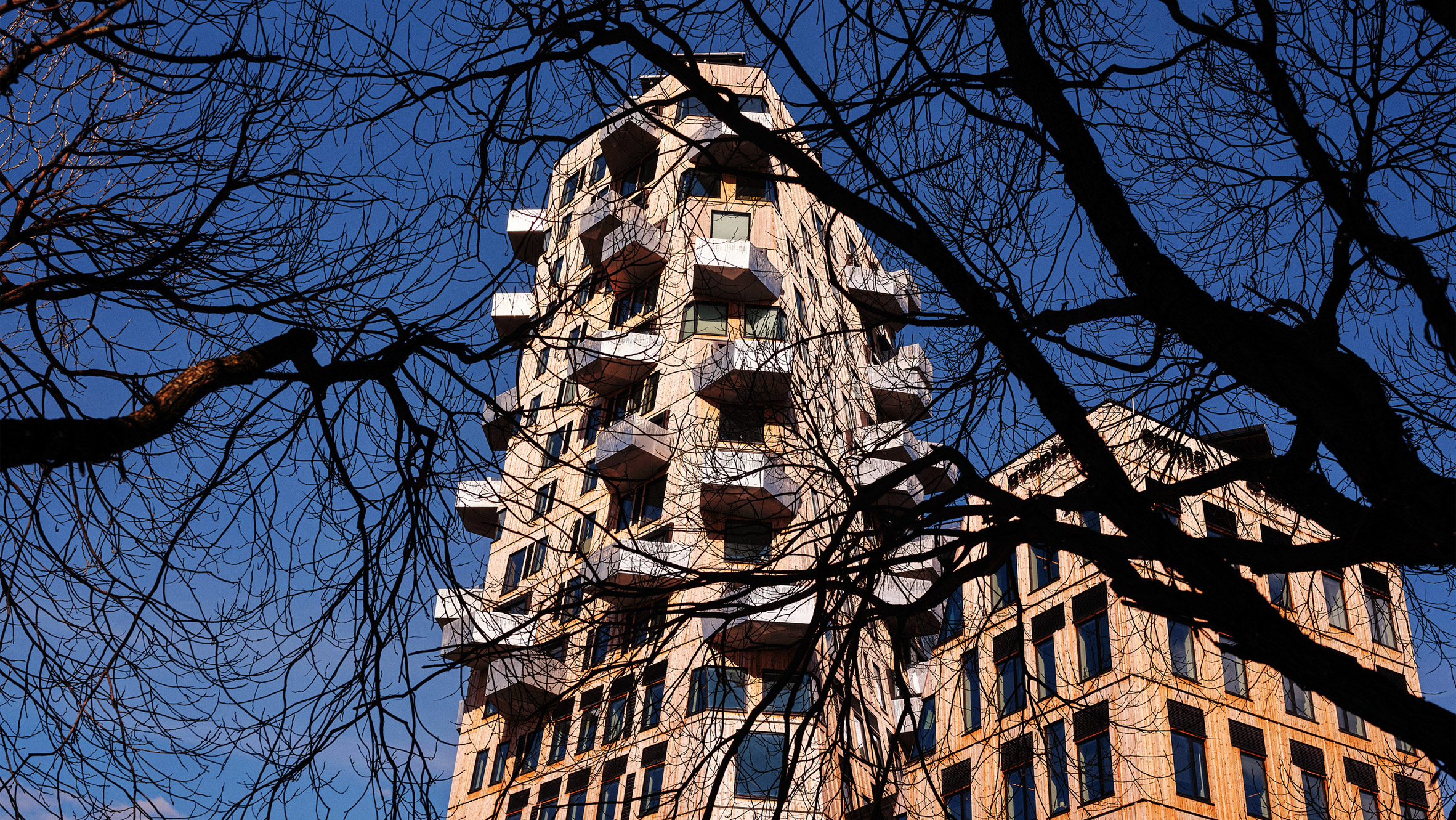 Standing at 18 stories tall, Vertikal Nydalen hosts restaurants on the ground floor, offices on the subsequent five levels, and apartments crowning the tallest tower. Snøhetta strategically divided the building into two volumes to preserve sightlines and maintain a lighter aesthetic.