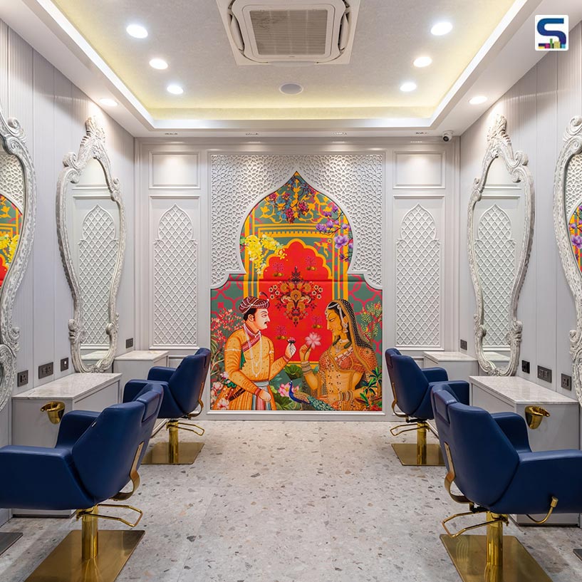 The design exudes royalty with colorful paintings and posters that highlight the state's royal heritage. Massage rooms are set against a backdrop of molded shelves with various trefoil arch patterns, allowing guests to fully unwind. The flooring, finished with terrazzo tiles, evokes the grandeur of old forts and palaces.The space is elevated with vibrant furnishings and brass accents, enhancing luxury and aligning with the royal theme.