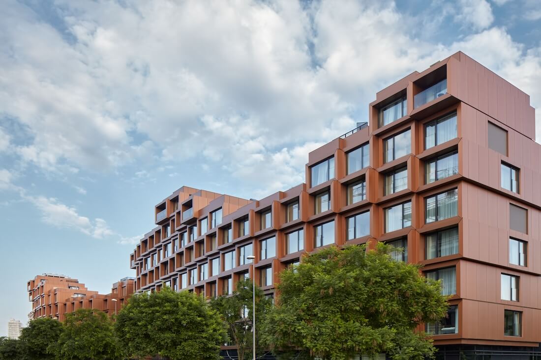 This form optimizes sunlight for apartments, and the projecting boxes create a dynamic interplay of light and shadow, enhancing the façade’s visual impact and human scale.