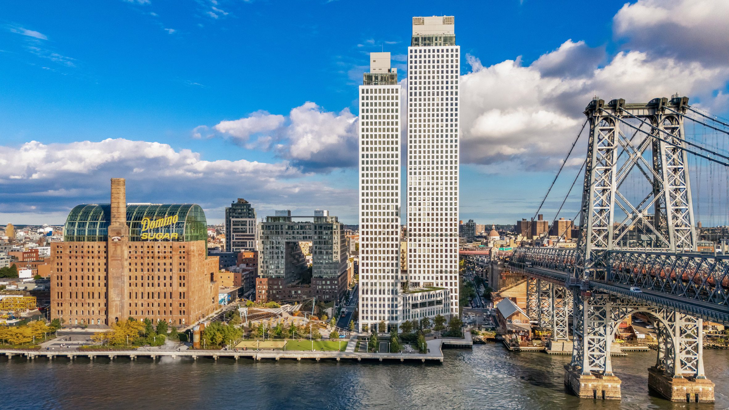 The two skyscrapers rise above a six-story triangular podium along Domino Park. The shorter tower houses condominium units, while rental units are located in the taller south tower.
